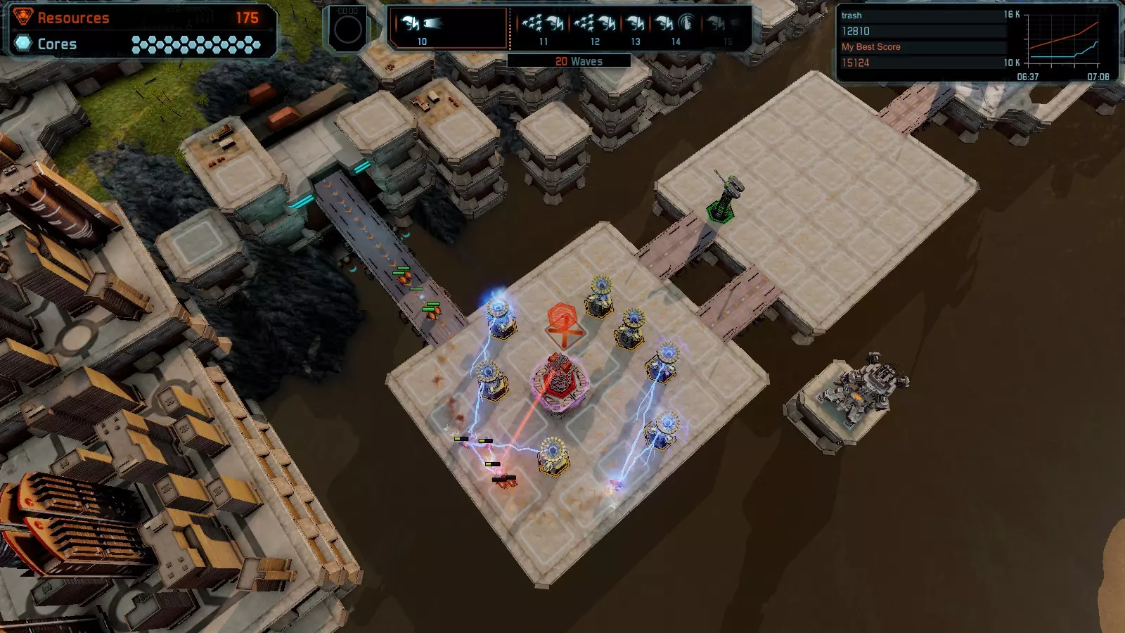 第14关 表面张力 本指南介绍如何在简单难度的开放模式和竞争模式下在此地图获得金牌。 此布局可在以下所有模式中获得金牌: 固定资源 电力中断 焦点 有限塔防 全负荷 练习 建造方案: 1座红色激光塔 1座红色特斯拉塔 1座增益塔搭配1座带得分加成的红色震荡塔 3座绿色加农炮 4座红色加农炮 2座增益塔各搭配2座带干扰器的红色加农炮