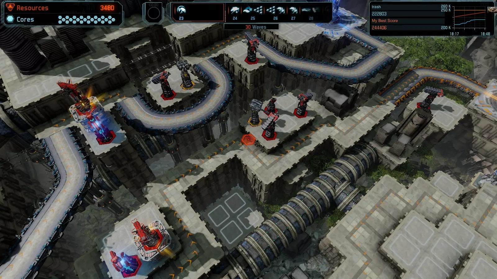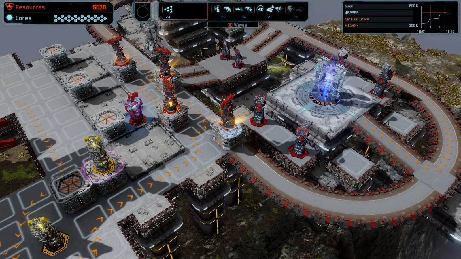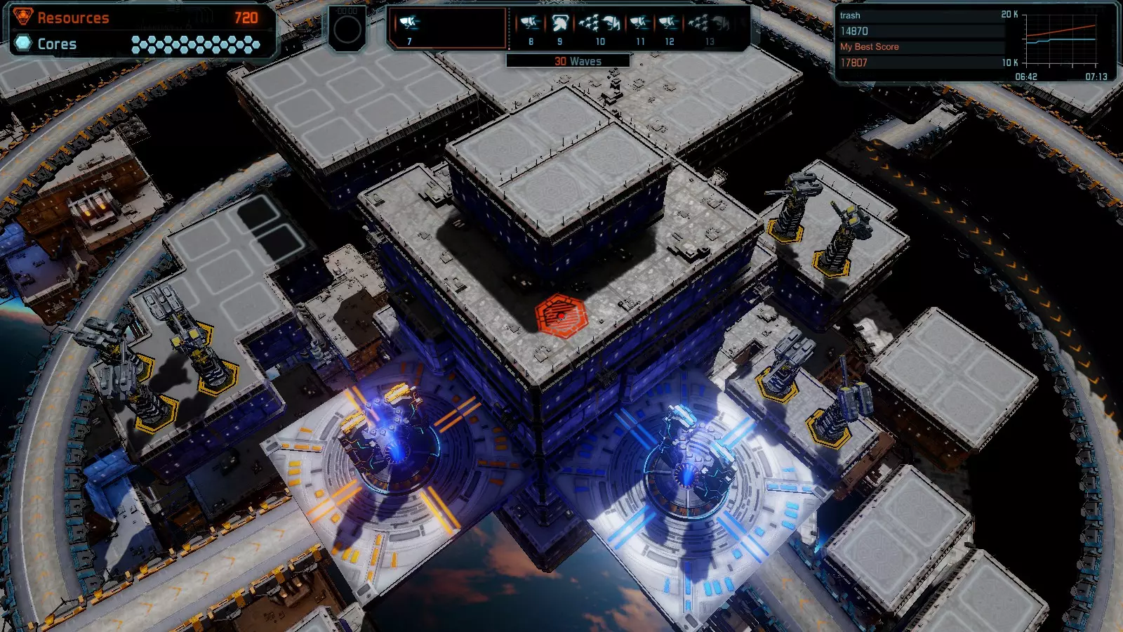 地图07 艰难抉择 本指南将介绍如何在简单难度下的开放模式和竞争模式中获得该地图的金牌。 以下模式均可使用此布局获得金牌: 固定资源 有限塔楼 全装模式 核心冻结 练习模式 建造方案: 5座红色激光塔 3座红色时间塔 2座黄色流星塔 9座红色加农炮