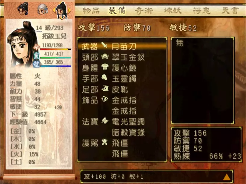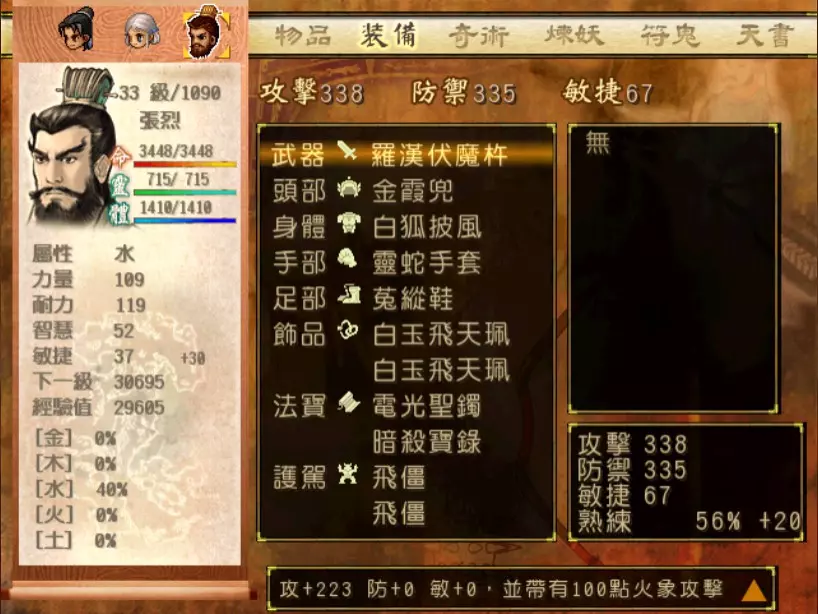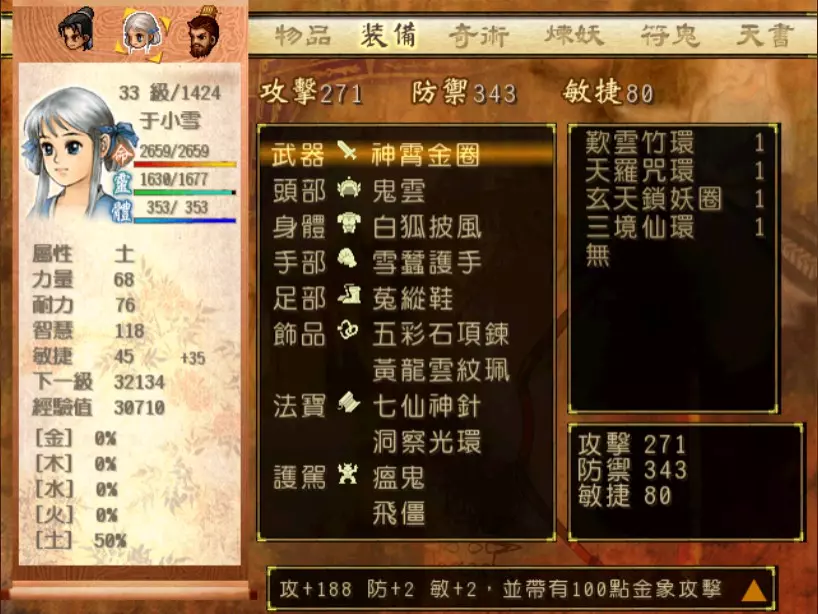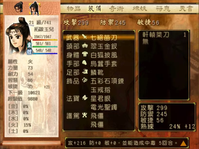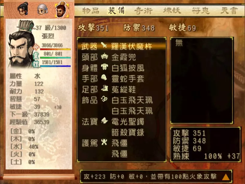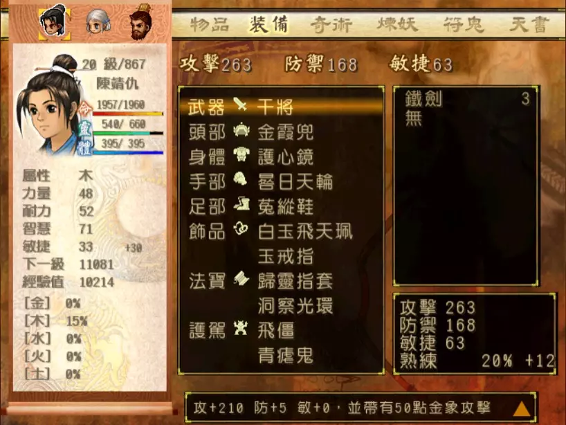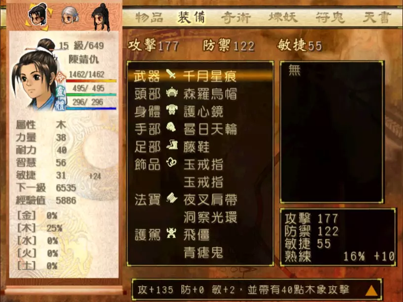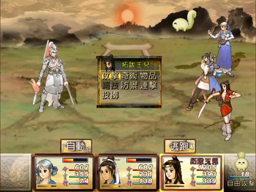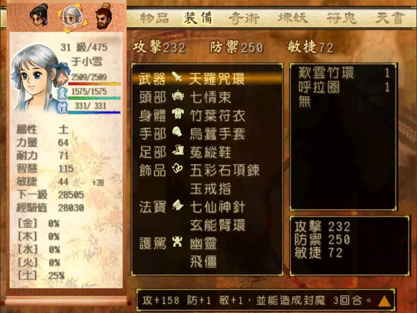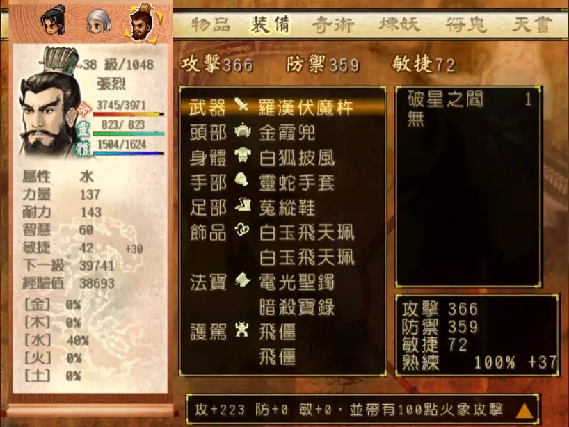 经验值 1200 → 靖仇 Lv 16,小雪 Lv 15-16,玉儿 Lv 20-21 这一场真的难,但回报是丰硕的经验值。 斛律安除了普攻之外的其他攻击都可以打得我方三人难以招架: 金象「坎离雷电」,全体 500-700 伤害。这大概还算可以,可以用凤尾草液一回合补回来。 金象「太阴神雷」,单体 1200 伤害,靖仇则是约 1500,对靖仇和小雪都是一击必杀。 金象「靛雷裂地」,全体 800-1000 伤害,就算三人血全满也会几乎招架不住。 还有最可怕的绝技攻击,全体 1200 以上伤害,一不小心就会全军覆没。 小雪在 14 级的生命值只有 1051,作为重要的补师角色,生命值真的太少了。为了减少她阵亡的机会,我把现阶段能收集到的不老之泉水(2瓶)和神木之精都给她使用,勉强凑到了1231点生命值,满血的情况下可以抵御一次绝技攻击。 更可怕的是,斛律安的敏捷是迄今为止打过的魔王中最高的,甚至比之后要打的宇文太师还高。在战斗中,常常会发生被第一次全体奇术攻击打成残血后,还没有足够的时间恢复,就迎来第二次的绝技攻击(绝技攻击没有蓄气时间,所以有时会觉得魔王怎么可以连续动作),然后我方就全灭了…… 为了遏止上述情况的发生,玉儿的冯虚御风绝对是必要的,必须时不时就使用此招,让速度提升的状态常驻于三人身上。小雪的石龟护甲也可以考虑使用,可以防止被轰成只剩一人残血存活后,被斛律安的普攻轻松解决掉的状况。 另一方面,我方也缺少可以克制金象敌人的火象奇术。输出最有效的是玉儿的星火长空,可以造成约600点伤害,但仍然不高。因此请不要吝惜道具吧!天仙酒、翔羽叶、雨皇花、蟠桃等等,该用就用。 到目前为止,可以收集到4个金块(1个在龙舟上、小业子给2个,巴蜀古王墓中可以找到1个)。我在鵁精身上用了一个,这场战斗中投掉了第二个,可以造成2000伤害。最后我想要强调防御的重要性,因为小雪缺乏输出奇术,又是专职型的补师角色,因此如果大家的生命值全满,就防御吧,受到攻击可以少扣200-300生命。不要贪恋攻击,小雪阵亡后只能用没什么效率而且可能又会被打死的还魄丹复活,还会让全队陷入危险之中,得不偿失。 不管如何,要打赢这一战可能还是需要一点运气,如果被打败了就再接再厉吧。打赢后在出古墓前记得要撤下小雪的装备,等待她再次归队。 河西区域、洛阳通天塔 皇家宝物库中没有需要打赢的战斗。如果遇到飞贼王,选择阻止他之后可以逃跑,打隐藏魔兽的条件一样可以达成。下一战在灵武,小雪没有参加。 35.韩腾 难度:★★★(仇 等级16,玉 等级21)