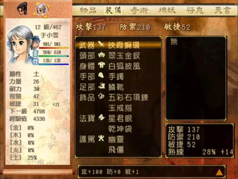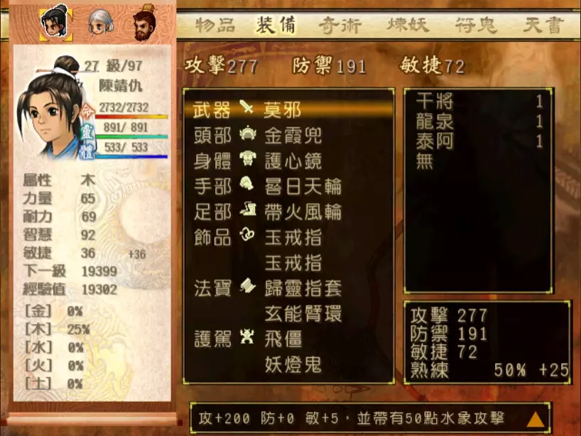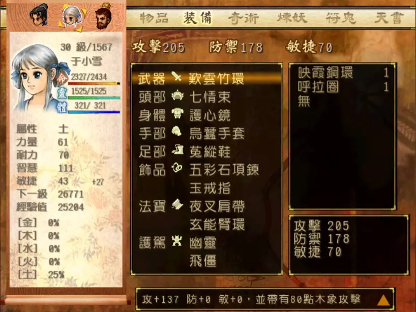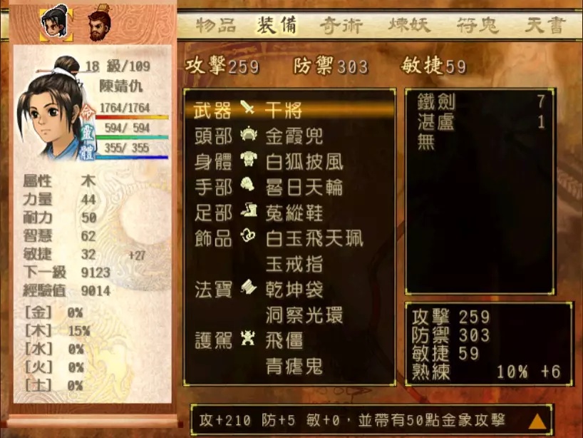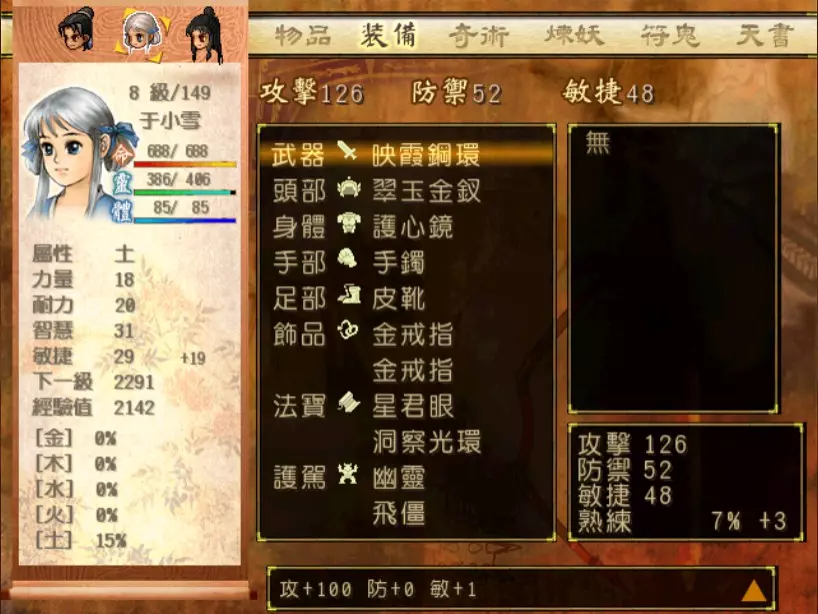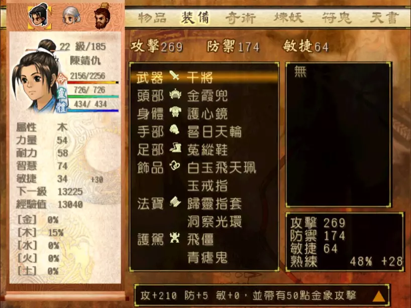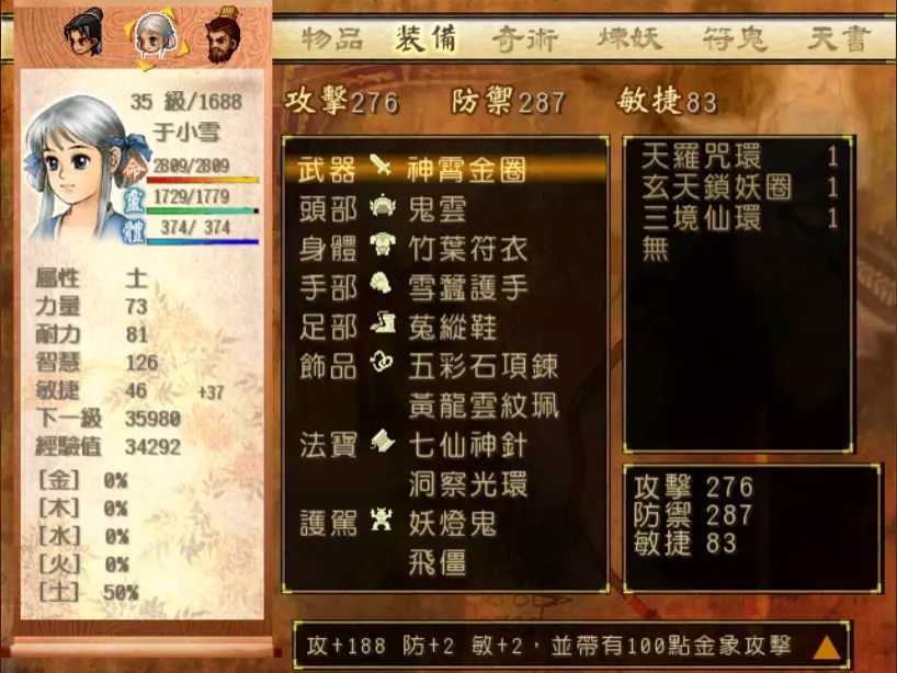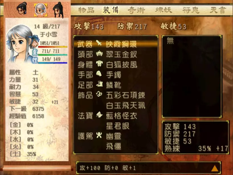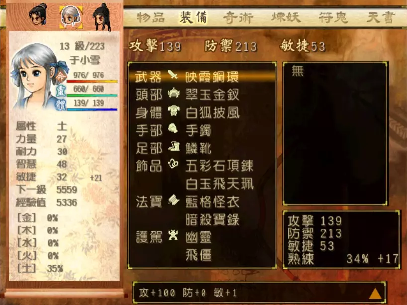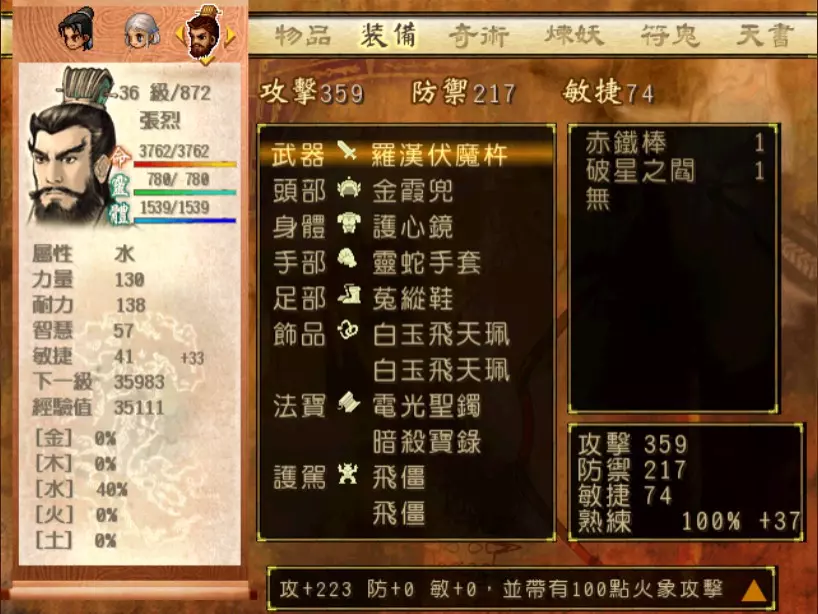 经验值 1200 → 靖仇 Lv 16,小雪 Lv 15-16,玉儿 Lv 20-21 这一场真的难,但回报是丰硕的经验值。 斛律安除了普攻之外的其他攻击都可以打得我方三人难以招架: 金象「坎离雷电」,全体 500-700 伤害。这大概还算可以,可以用凤尾草液一回合补回来。 金象「太阴神雷」,单体 1200 伤害,靖仇则是约 1500,对靖仇和小雪都是一击必杀。 金象「靛雷裂地」,全体 800-1000 伤害,就算三人血全满也会几乎招架不住。 还有最可怕的绝技攻击,全体 1200 以上伤害,一不小心就会全军覆没。 小雪在 14 级的生命值只有 1051,作为重要的补师角色,生命值真的太少了。为了减少她阵亡的机会,我把现阶段能收集到的不老之泉水(2瓶)和神木之精都给她使用,勉强凑到了1231点生命值,满血的情况下可以抵御一次绝技攻击。 更可怕的是,斛律安的敏捷是迄今为止打过的魔王中最高的,甚至比之后要打的宇文太师还高。在战斗中,常常会发生被第一次全体奇术攻击打成残血后,还没有足够的时间恢复,就迎来第二次的绝技攻击(绝技攻击没有蓄气时间,所以有时会觉得魔王怎么可以连续动作),然后我方就全灭了…… 为了遏止上述情况的发生,玉儿的冯虚御风绝对是必要的,必须时不时就使用此招,让速度提升的状态常驻于三人身上。小雪的石龟护甲也可以考虑使用,可以防止被轰成只剩一人残血存活后,被斛律安的普攻轻松解决掉的状况。 另一方面,我方也缺少可以克制金象敌人的火象奇术。输出最有效的是玉儿的星火长空,可以造成约600点伤害,但仍然不高。因此请不要吝惜道具吧!天仙酒、翔羽叶、雨皇花、蟠桃等等,该用就用。 到目前为止,可以收集到4个金块(1个在龙舟上、小业子给2个,巴蜀古王墓中可以找到1个)。我在鵁精身上用了一个,这场战斗中投掉了第二个,可以造成2000伤害。最后我想要强调防御的重要性,因为小雪缺乏输出奇术,又是专职型的补师角色,因此如果大家的生命值全满,就防御吧,受到攻击可以少扣200-300生命。不要贪恋攻击,小雪阵亡后只能用没什么效率而且可能又会被打死的还魄丹复活,还会让全队陷入危险之中,得不偿失。 不管如何,要打赢这一战可能还是需要一点运气,如果被打败了就再接再厉吧。打赢后在出古墓前记得要撤下小雪的装备,等待她再次归队。 河西区域、洛阳通天塔 皇家宝物库中没有需要打赢的战斗。如果遇到飞贼王,选择阻止他之后可以逃跑,打隐藏魔兽的条件一样可以达成。下一战在灵武,小雪没有参加。 35.韩腾 难度:★★★(仇 等级16,玉 等级21)