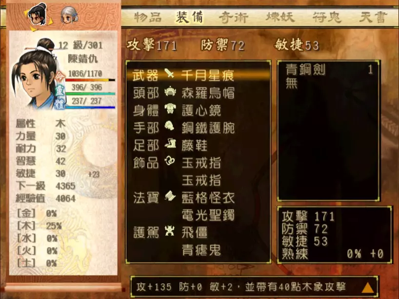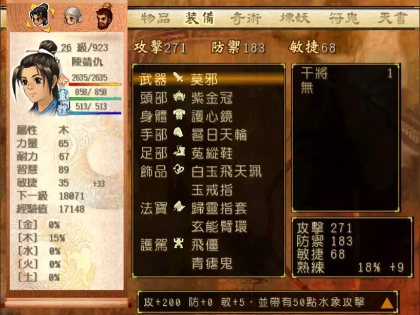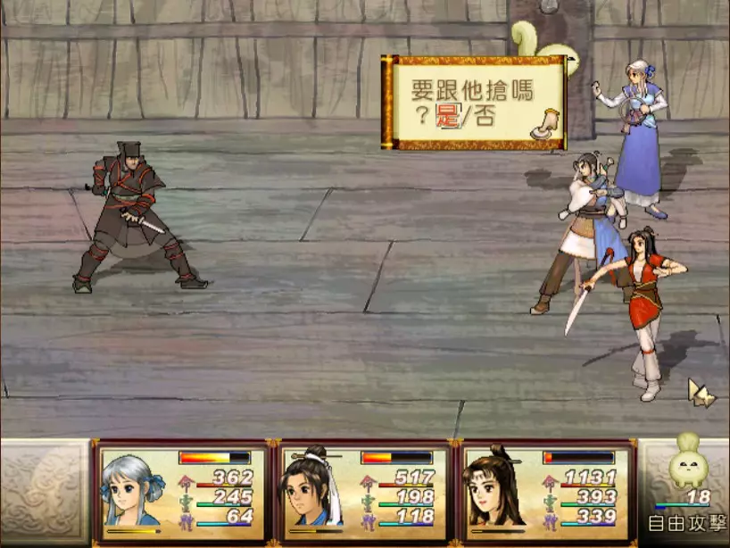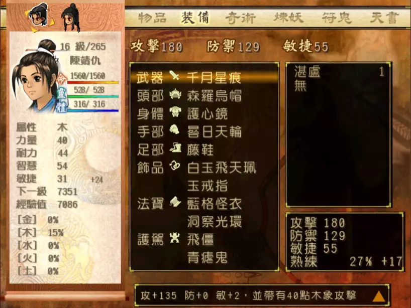 经验值 870 → 仇 Lv 17,玉 Lv 22 因为我方只有两个人,而且缺席的又是小雪,因此洞察光环再次体现出它的重要性──每闪过一次韩腾的攻击,都等于省下了一堆昂贵的补药。至于洞察光环给谁装备?当然是补师陈靖仇,虽然他只有普通的气疗术,不过聊胜于无。带多一点金创药和凤尾草液吧,虽然我分别只带了4个和8个(没办法,金创药太贵了...) 韩腾唯一具有威胁性的招式是木象【怒空摘星】,全体约1350伤害。很痛,不过至少两个人满血时都扛得住。这里我倒是使用了一个进阶策略:猜测敌方是否要使用奇术。因为使用奇术需要蓄气时间,如果发现韩腾似乎有好一阵子都没出手攻击了,就赶快按下防御,看能不能猜到是怒空摘星。如果猜到,可以降低伤害到1000左右,让我方有多一点余裕准备接下来的应对策略。 我这场主要的输出是靠玉儿,冯虚御风的加持下加上有星君眼加成的连击,每半回合约可以造成500左右的伤害,如果有什么突发状况更可以及时应对。 个人觉得可惜的是,两人身上能带的法宝有限,经过挣扎后决定还是不装乾坤袋偷活灵芝好了。 接下来玉儿要潜入宇文太师府。这边所有的遭遇战都可以顺利逃走,但因为我这次是玩小雪线,所以要准备把装备卸下,跟玉儿说拜拜了。 36.逃犯x2 + 土匪 难度:★(仇 Lv 17)经验值 130 前往太原途中的路见不平。请记得使用冰石乱坠冻结敌人。 下一场战斗来到了通天塔。入塔前可绕道去大兴的独孤道塔逛逛拿宝物,尤其是金块,这样身上又有3块金块了。 37. 飞贼王+陆吾 难度:★(仇 Lv 17,烈 Lv 32)经验值 58 这场战斗其实只是支线战斗,奖品干将也没有很吸引人,我只是纯粹想凑齐干将莫邪。 在Steam版《轩辕剑叁外传 天之痕》中,制作团队为了防止收化飞贼王的漏洞,让陆吾不能被收化。把陆吾打败后,可静待飞贼王本人逃跑,以吸取最少的经验值。 38. 韩腾 难度:★★★(仇 Lv 17,烈 Lv 32)