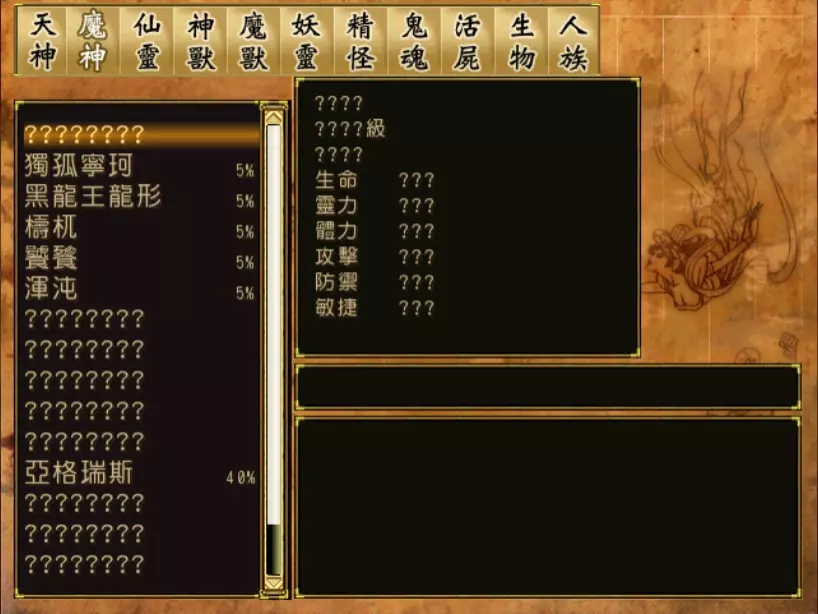 经验值 1500 → 仇 Lv 26,雪 Lv 34,烈 Lv 37 第一次来巴蜀古王墓的时候,靖仇 Lv 15,小雪 Lv 14,玉儿 Lv 19,根本打不赢。原因是梼杌的土象奇术【无空幽石】会对三人造成 2000 点伤害(靖仇是 1500,张烈是 2800),秒杀除靖仇外的两人。是可以给靖仇装备青龙灵珠,提高木象抗性后有机会把伤害降到 1100 左右或是更低,但在这个等级区间,想要复活队友只能靠还魄丹或轮回盘。就算忽略一场打下来过于庞大的补药费用,在这个脆弱的时候,只要梼杌乘胜追击使出任意全体攻击招数,就注定是全灭。 从魔界中原回来后,第二次前来挑战。这次小雪新增了「风沙甘霖术」和「唤魂咒」,当三人生命值都高于2500时,难度大概就和其他魔王差不多。小雪的生命值只要不低于2000,就能确保不被无空幽石打死并持续治疗队友。记得再装备七仙神针来确保一次续命。 由于梼杌具有极高的五行抗性(吸收火、金、土属性,抵抗水、木属性),因此连击甚至普攻的输出效率会更好一些。因为单回合造成的伤害无法拉高,战斗可能会持续很久,但只要小雪的治疗效果到位,就能切实节省补药。 胜利后张烈终于会学到「蛇云缠腿」,这是一个重要性不亚于「冯虚御风」的奇术! 如果您想要挑战更高难度的梼杌BOSS战(可能打得过吗?)可以试试在进入魔界中原前的任何时间,只有靖仇和张烈两人时回来打。非常想见到攻略心得! 46. 混沌 难度:★★★★(靖仇等级26,小雪等级34,张烈等级37)