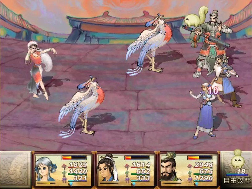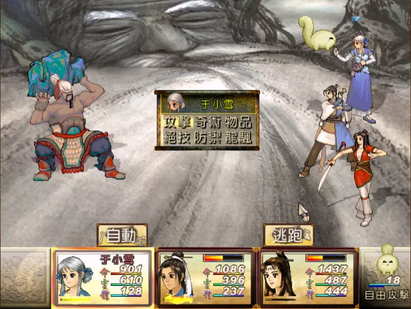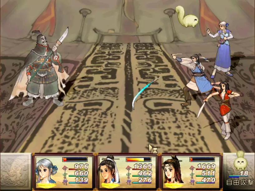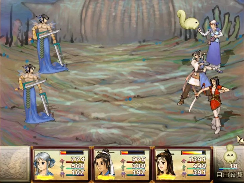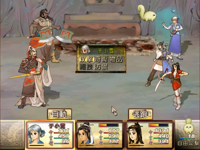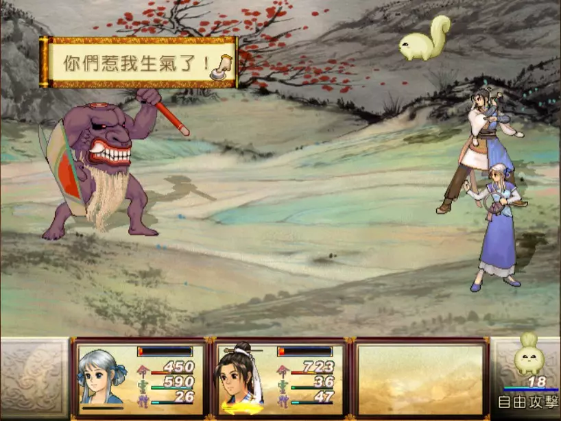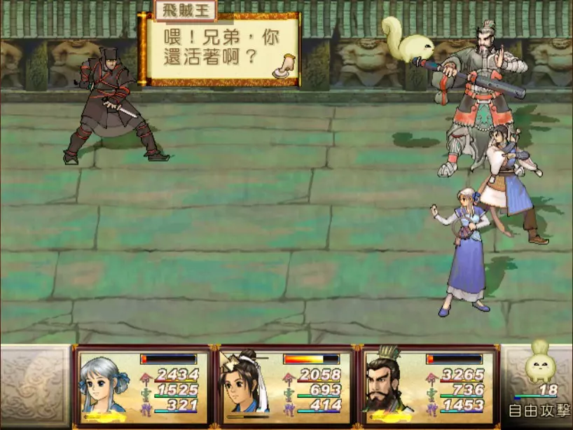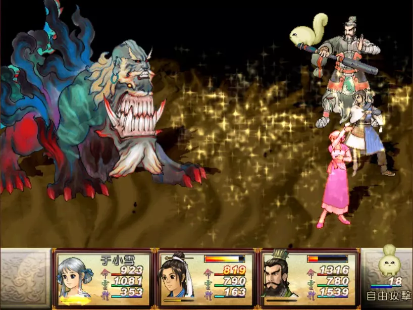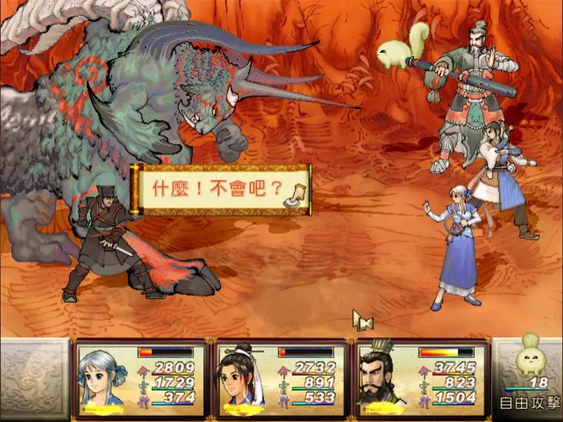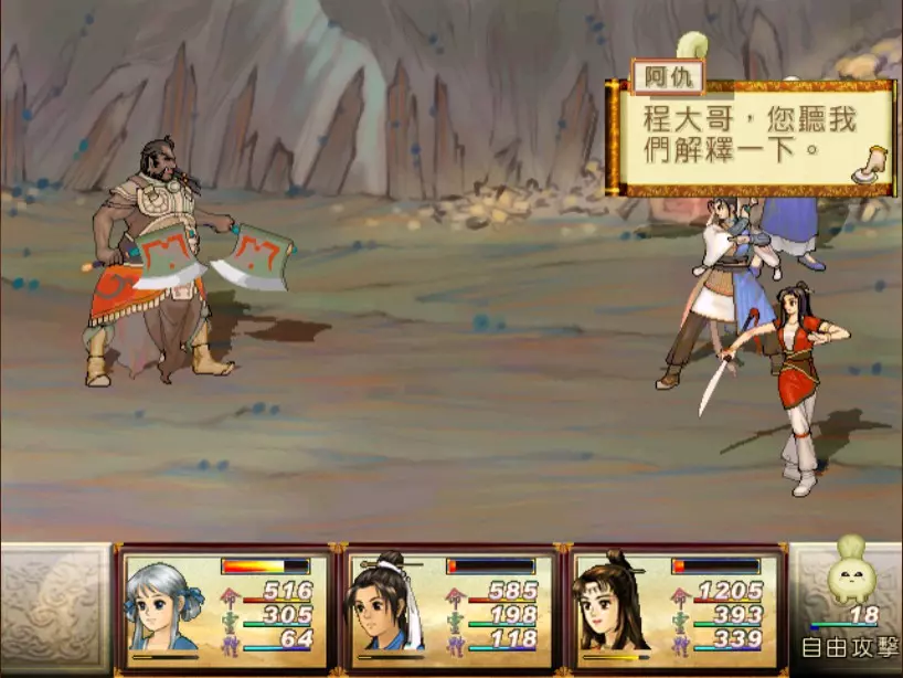 经验值 494 → 陈靖仇 Lv 9,于小雪 Lv 9,拓跋玉儿 Lv 15 在此之前完全没预料到,鵁精会是前期最难的一场战斗。两只鵁精的难度都是五星。 在鵁精变红色、发怒前,最有威胁性的是木象全体奇术【风卷残云】,除了玉儿补血外,其他两人会受到400-500点伤害。加上鵁精的普攻带有中毒几率,一不小心就会陷入阵亡的边缘。打法类似对峙杨硕时的方法,使用玉儿作为主输出,投掷刚买的铁剑或进行连击,再加上小雪的【烈火术】作为辅助输出。由于靖仇终于学会【气疗术】了,他专注当治疗角色就可以。 【凤尾草液】非常好用,可以一次补满被【风卷残云】带走的血量,可以预先多买一些。因为鵁精普攻的中毒概率高,所以其实也不用一中毒就立刻解除,等到血一次会扣到100多再解就行了。 高难度的战斗在于后半段,当鵁精剩下约1500至2000血的时候会使用【抽丝剥茧】,削弱我方防御力后进入愤怒模式。在愤怒模式下,鵁精敏捷值大幅提升,并且会连续进行五次普通攻击,带来约1000点左右的伤害,瞬杀小雪和靖仇。照理说这个攻击应该可以用【洞察光环】挡下来,不过我在实战中无法只靠此方法撑过去,不需两三回合必定全军覆没。目前我发现唯一的解法是投掷金块,在有使用铁剑练熟练度的状况下,玉儿丢一次可以造成1500的伤害,再搭配一至两次的普通或绝招攻击就可以击败鵁精。 在采药洞窟之前,只可能得到一块金块。也就是说,如果你不小心卖掉或用掉了,在鵁精这一关就卡死了,没有办法在等级9的时候就通关。 打赢之后回到魔王砦,迎接下一场硬战... 23. 程咬金+秦叔宝 难度:★★★★(仇等级9,雪等级9,玉等级15)