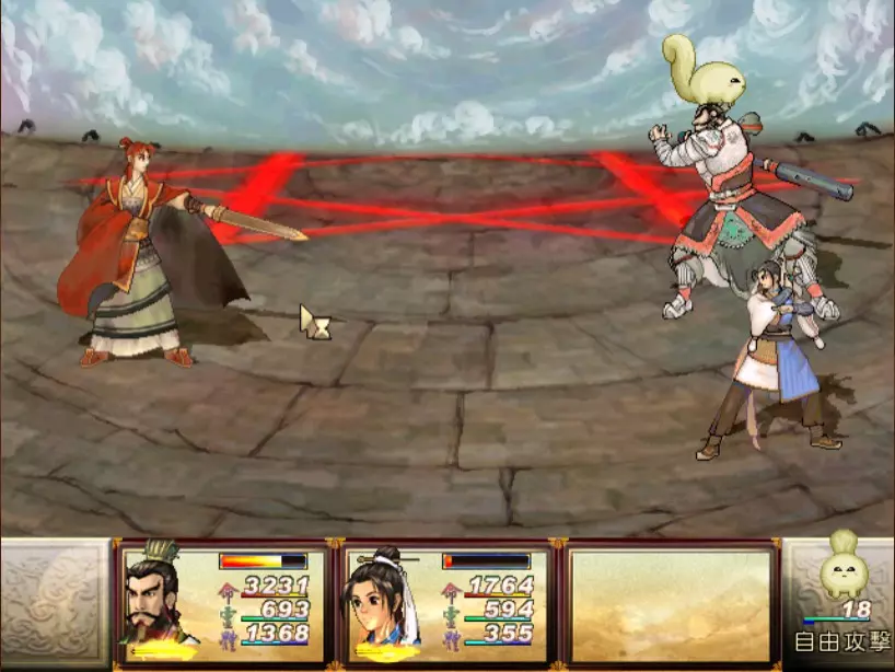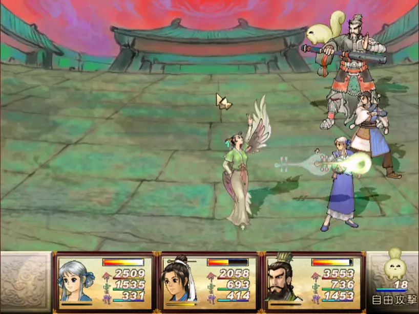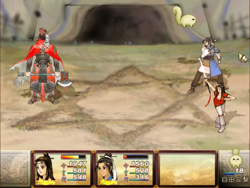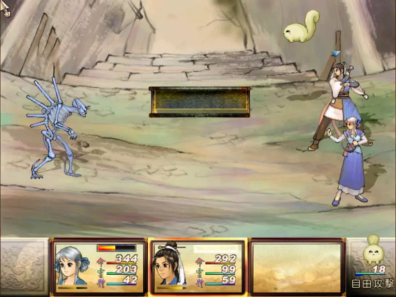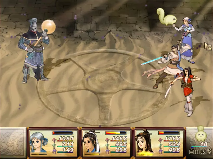 经验值 1000 → 陈靖仇 Lv 13-14,于小雪 Lv 13,拓跋玉儿 Lv 18 虽然盘古的普通攻击很痛(至少500以上),但麻烦的还是奇术【石破惊天】,可以打出1200点以上的单人伤害,对于于小雪和陈靖仇是一击必杀。幸好这招不是全体攻击,因此还魄丹或轮回盘只要带够是可以撑得住的。至于老招式【涛澜动地】,就用鹿茸膏或凤尾草液来回复吧。 攻击方面,因盘古的土象属性之故,我使用陈靖仇的【羊筋蚀骨】配合找到的【阿修罗之森】进行输出,一次可打1000滴血以上。其他的主要输出方式包括天仙酒加连击或是买翔羽叶来投掷。 如果有多余精力,记得偷舍利子,之后要使用或是拿来卖钱都很不错。 打完后陈靖仇第一次连升两级,真爽。江南区域、巴蜀古王墓 回到人间界后,记得找时间去大梁找DOMO组员小业子猜拳,猜赢三次可以得到2块金块! 战斗从长沙隋营开始。这里可以避开所有隋军队长直抵主营帐。 30. 斛律安 难度:★★(仇等级14,雪等级13,玉等级18)经验值0 必败,难度2是因为可以试着偷偷获取蜂王露,卖钱或吃掉都很不错。 31. 上官震远 难度:★★★★(仇等级14,雪等级13,玉等级18)