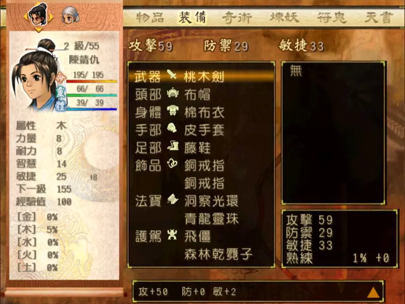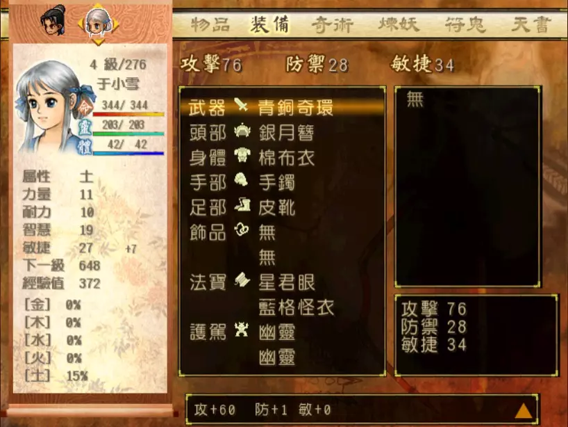 经验值 250 → 小雪 Lv 8,玉儿 Lv 14 阳硕的普通攻击不具威胁性,但是奇术【狂木潮】就有点痛了,幸好玉儿的属性克制可以补血。其他两人都会受到400-500点伤害。只要阳硕不连续发动两次【狂木潮】,是可以慢慢用【气疗术】把血补回来的,如果想要更保险一点,就使用【凤尾草液】吧。 攻击输出方面,在这个等级仍然没有什么强力的手段,只能靠普通攻击或连击,再加上偶尔释放的绝招慢慢消耗。 发现、归还【神农鼎】 首先来到河边空地,登上宁珂郡主的船只。 20. 隋军队长 难度:★(陈靖仇 Lv 7,小雪 Lv 8,玉儿 Lv 14)经验值 22 → 陈靖仇 Lv 8 21. 火蝠鱼精 难度:★★★(陈靖仇 Lv 8,小雪 Lv 8,玉儿 Lv 14)