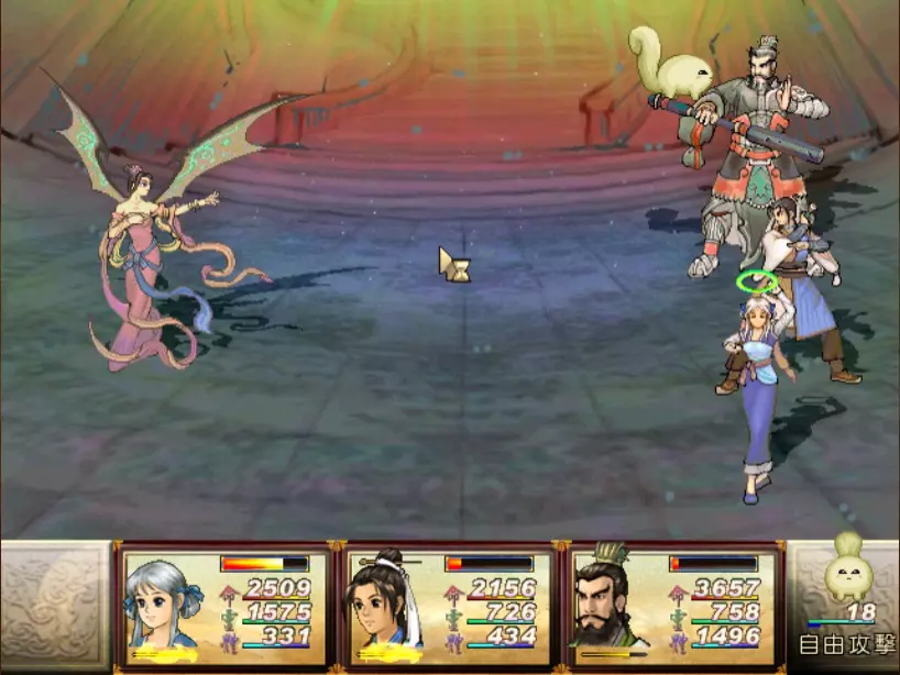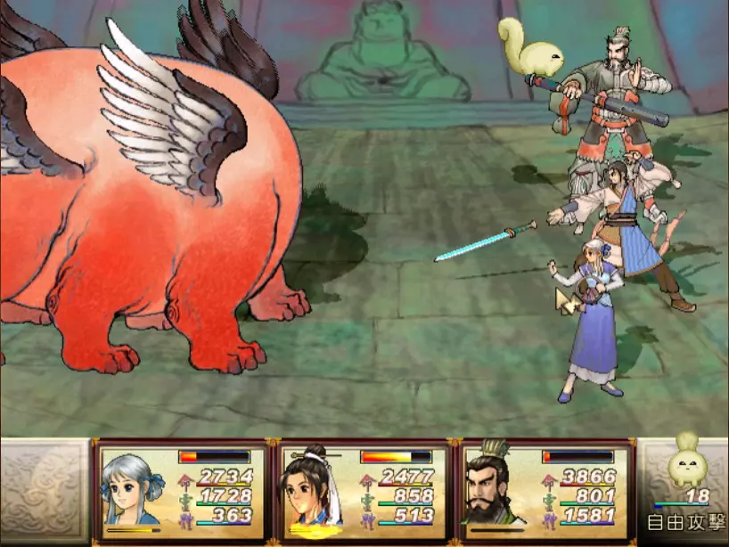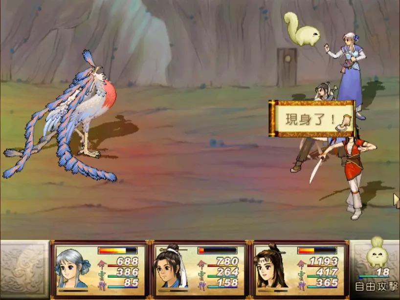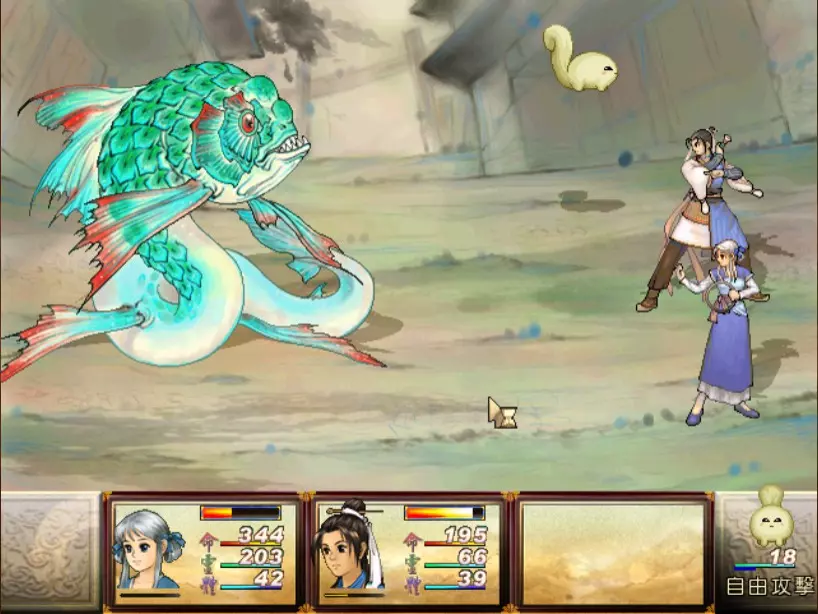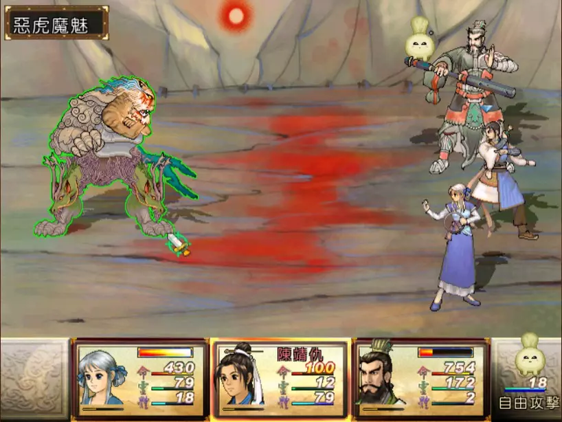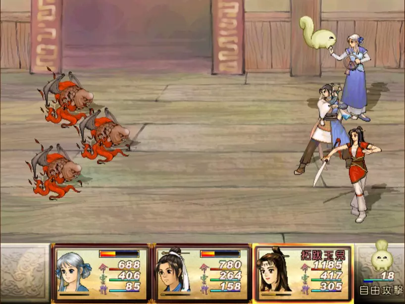 经验值 1530 → 仇 Lv 21,烈 Lv 34 尉迟嫣红有一招具有威胁性的攻击奇术:火象【日薄西山入】,小雪补血时其他人会受到约 900-1000 点伤害。看似尚可,但护驾当扈才是真正的威胁。当扈有很高的概率发动土象【涛澜动地】(约 900 点全体伤害)。如果两只当扈都发动此技能,再加上【日薄西山入】,我方就几乎会进入团灭状态。这场战斗的关键就是尽一切力量防止当扈发动【涛澜动地】。 由于当扈血量很厚(1800,比赤贯星上的很多神灵还要高!),我方没有任何持续有效的方法能在一两个行动内消灭一只当扈,而且尉迟嫣红在当扈全灭后有可能召唤出新的当扈,所以最好的方法就是绝对不要让尉迟嫣红召唤出第二轮、第三轮的当扈。首先,尽全力打死一只当扈,然后对另外一只定期使用定影灵针、冰石乱坠或梦狐残神,使它在尉迟嫣红阵亡前再也无法行动,这样我们只要专心处理尉迟嫣红本人就好。 尉迟嫣红的普攻会吸取等量的生命,因此力求速战速决,尽可能选择伤害大的方式来攻击,或是在一回合内三人都进行攻击。于是张烈担当主输出,百川汇流可打掉2100以上的生命。靖仇可用流云刺,小雪则可用万蛊缠身,虽然伤害没有很高,但至少可以让敌方无法回复生命。 这一场是难得使用灵力作战的战斗。没灵力的话就用夜叉肩带、道具,或是等白狐披风自动回灵吧。我也把乾坤袋取下了,比起浪费好多行动回合都偷不到没什么作用的紫玉冰晶,还是使用道具保命比较重要。噢对了,记得小雪的【唤魂咒】就算队员没有濒死时也可以用,可回复相当于一个金创药的量。 打赢后如果不想花钱住旅馆补血,可以前往氐人国鱼肚内的冰箱免费回复。在魔界中原的其他所有魔王也一样。 42. 飞贼王+吸血巨人 难度:★(仇 Lv 21,雪 Lv 30,烈 Lv 34)