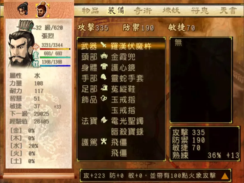 经验值 104 类似怒意鲛精的打法,小雪土灵爪为主要输出。可先买一点罗勒草给靖仇充当称职的补师。因为黑山镇商店没有卖还灵丹,所以法术放完后就尽量靠防御和洞察光环格挡的方式累积怒气值,最后靠绝技来输出伤害。因邪尸骷髅可以把之前我们收到的妖怪一击毙命,所以护驾开始变得没什么功用了。 张烈加入后可以开始明显感受到同伴与主角的等级差异 进入森林军营营地后,会有两场一定要打的小兵战,没什么难度。再后来才会是魔王。 7. 隋军枪兵x2 难度:★(仇 Lv 3,雪 Lv 4,烈 Lv 8)经验值 34 → 仇 Lv 4,雪 Lv 5 8.隋军队长x2 难度:★(仇 Lv 4,雪 Lv 5,烈 Lv 8)经验值 44 电光圣镯军营营地可以拿到的电光圣镯非常好用,它提供比普通攻击还要高一点的伤害。在压等限制下法宝无法获得太多经验,在后期可能没办法像奇术那样打到破千,不过其优点是省去奇术的蓄气时间,保持我方最大的机动性。如果与天仙酒合用,后期最高的输出约是一回合 2000。 9. 邪尸骷髅→恶虎魔魅 难度:★★★(仇 Lv 4,雪 Lv 5,烈 Lv 8)