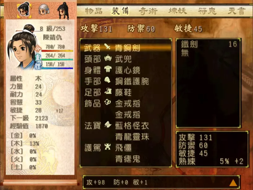 经验值 280 → 陈靖仇 Lv 5,于小雪 Lv 6 就算一个奇术都没有,张烈仍是非常强力的同伴。给张烈装备电光圣镯,以连击加上绝技攻击,稳扎稳打。其他人可防御或用奇术辅助。当敌方使用炽羽袭时,就赶快使用于小雪或凤尾草液补血。 运输船、龙舟迷宫 这里要面对蜂拥而上的隋军。 10. 隋军步兵x2 难度:★(陈靖仇 Lv 5,于小雪 Lv 6,张烈 Lv 8)经验值 26 11. 隋军队长x2 难度:★(陈靖仇 Lv 5,于小雪 Lv 6,张烈 Lv 8)经验值 44 12. 隋军队长x3 难度:★(陈靖仇 Lv 5,于小雪 Lv 6,张烈 Lv 8)经验值 66 13. 隋军队长x4 难度:★★(陈靖仇 Lv 5,于小雪 Lv 6,张烈 Lv 8)经验值 88 → 陈靖仇 Lv 6,张烈 Lv 9 四只队长有点麻烦,如果让他们其中一位使用攻击力上升的招数就糟了需快速将敌人数量减少到2-3只,不要吝惜使用飞刀或类似的投掷武器。 在龙舟迷宫中,有个金块一定要拿,可作为日后使用暗杀宝录的资源。 14. 隋军队长x2 难度:★(靖仇等级6,小雪等级6,张烈等级9)经验值0 这是为了遇到古魔兽梼杌而进行的战斗。消灭第一只后,记得选择饶过第二只,不会获得任何经验值和金钱奖励。 记得在屋梁上快到终点时,要把张烈的装备取下! 豆子坑、泰山 玉儿从这里加入我方团队,与靖仇的等级相差了7级! 15. 隋军队长 难度:★(靖仇等级6,小雪等级6,玉儿等级13)经验值22 纯粹用来试刀用。 16. 丁格 难度:★★★★(靖仇等级6,小雪等级6,玉儿等级13)