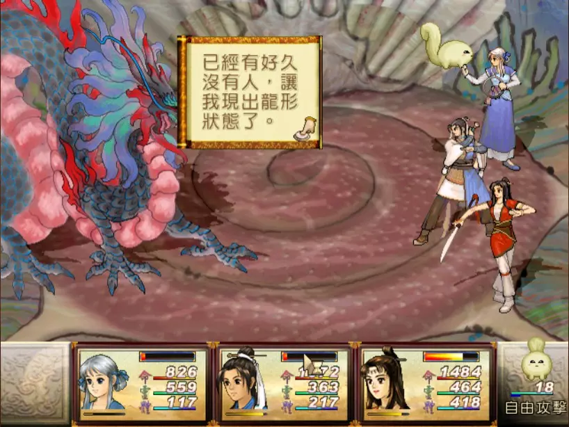 经验值 300 → 靖仇 Lv 11,小雪 Lv 11 打黑龙王之前的热身运动,很简单。值得一提的是因为蟹将会使用化精成虚,所以不用特意补充灵力,使用体力搭配法宝进行输出即可。 打完之后靖仇升到 11 级,生命值总算突破 1000 了。 27. 黑龙王龙形 难度:★★★(靖仇 Lv 11,小雪 Lv 11,玉儿 Lv 16)