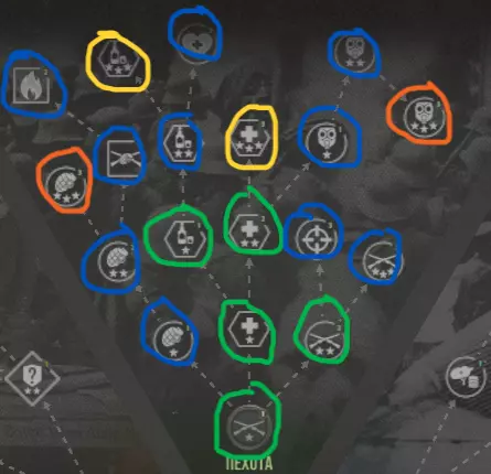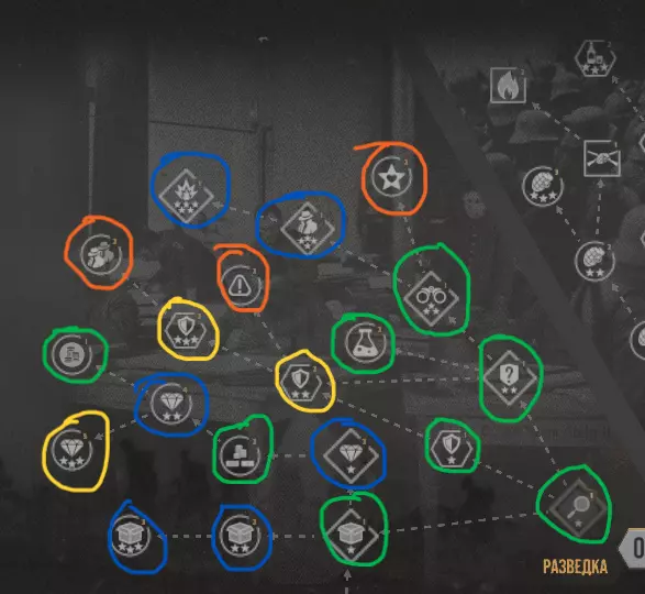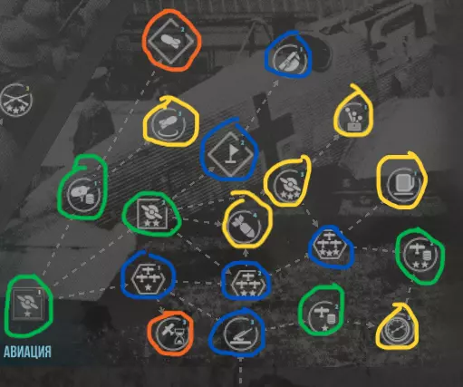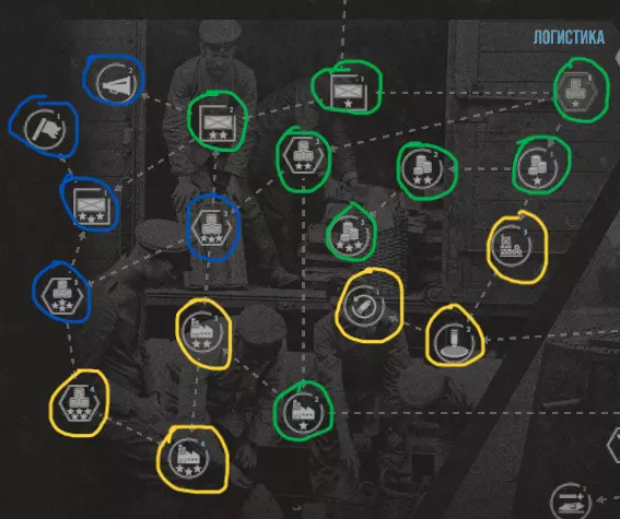 在这张图片中,你可以看到科技树,它被分为以下几个部分: 侦察 工程 战壕 步兵 后勤 航空 看起来很简单,对吧?或许是这样。但在这种简单背后,隐藏着重要的战略决策。在本章中,我们将一起分析每个部分,并且分享我的个人观点——哪些科技确实值得你关注,哪些则可以放心地放到后面再研究。 啊对了,重要提示: 协约国和中央 Powers 的科技树是相同的,除了初始研究项目。 协约国从一开始就拥有敌方建筑的侦察能力。 德国则拥有改良型火炮。 现在,言归正传!接下来我们来解析科技树的各个分支。 分支 截图说明:在解析各个分支之前,我先解释一下截图中会出现的标记,以便大家更容易判断哪些值得研究,哪些可以暂缓。 绿色圆圈:值得研发。 黄色圆圈:可以留到之后再研发。 蓝色圆圈:视情况而定。 橙色圆圈:根据个人喜好选择。 侦察:我们从侦察分支开始。它可能看起来不如其他内容重要,但其中包含一些有趣的科技:军团侦察、破坏行动、反间谍、支援等。 【援助包】可以消除部队的疲劳,升级后还能提升士气并允许部队重复使用。这是非常有用的功能,尤其是在你经常遭受攻击的情况下。 【侦察】包括军团侦察、破坏行动、反间谍。提供有助于规划作战行动的重要信息。建议在反情报研究之前进行研究,后续则根据情况而定。 奢华 允许用黄金兑换国家意志。如果您经常失利,这项功能尤其有用。升级后可享受火炮和飞机购买折扣。