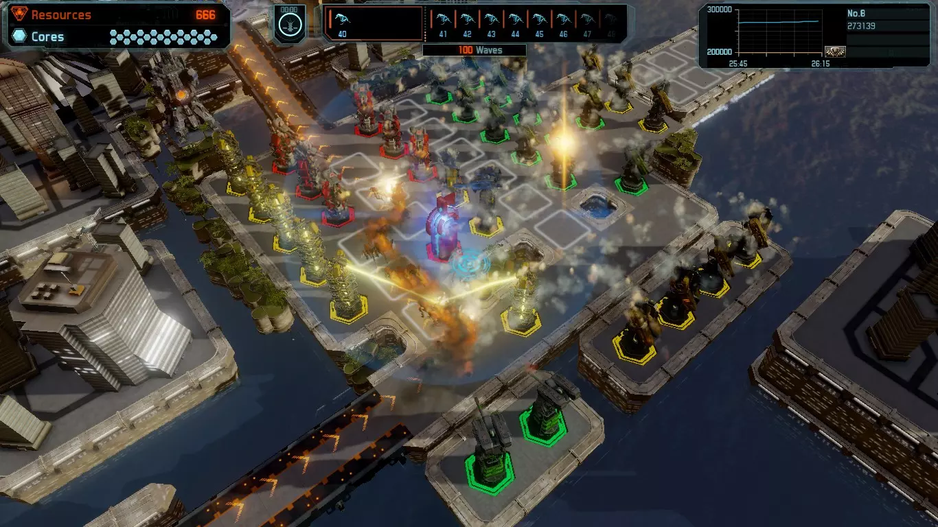 按列表依次说明: 第一项强化:提升所有造成的伤害25%; 第二项强化:显示隐形敌人并穿透护盾; 第三项强化:增加击杀敌人获得的点数。 需要注意的是,该加成并非对所有塔都生效,仅对建造在【Boost】上的塔有效。 提示 更新时间:引用自Good Game:截图中的塔防布局并非最佳。需要把它们像迷宫一样布置,让敌人尽可能长时间地沿着蜿蜒的路径移动。乍一看可能觉得一切都很简单。如果是打战役模式,那确实还算轻松。但如果玩的是100波敌人的模式,就需要好好思考如何合理分配资源,优先升级什么,以及在哪里建造下一座塔了。基于我的经验,我来尝试给出一些建议。在敌人行进的道路旁建造【Gun】塔,并且要建在最近的格子(第一个格子)。 建造【Temporal】塔时,使其作用范围覆盖敌人行进路线的大部分区域,这样就能对被减速的敌人进行更长时间的攻击。 尽快将【Temporal】塔升级到最高级。 在【Gun】塔后方建造【Laser】塔,并将其升级到2级。通常我只建造2-3座【加农炮】塔,让它们最先迎击敌人。 将【导弹】塔建造在最大射程位置,观察其作用范围。尽可能多地建造这类塔。与其升级其他任何塔,不如花300点建造一座【导弹】塔。 【导弹】塔的升级要放在最后进行。建造更多此类塔台比升级它们更好,因为升级到2级需要600点数,相当于两座新塔台。目前,我们有1级机枪塔、3级时间塔、1级激光塔和1级导弹塔。 升级机枪塔。 升级激光塔。 建造更多导弹塔。结果会是这样的: