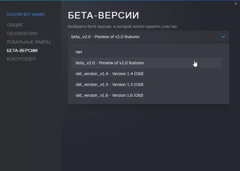 5. 再次将两个文件夹的内容仅移动到项目中 6. 激活程序的测试版,方法是在Steam中右键点击Discord Bot Maker,选择属性,然后在其中激活2.0测试版 + 安装nodejs