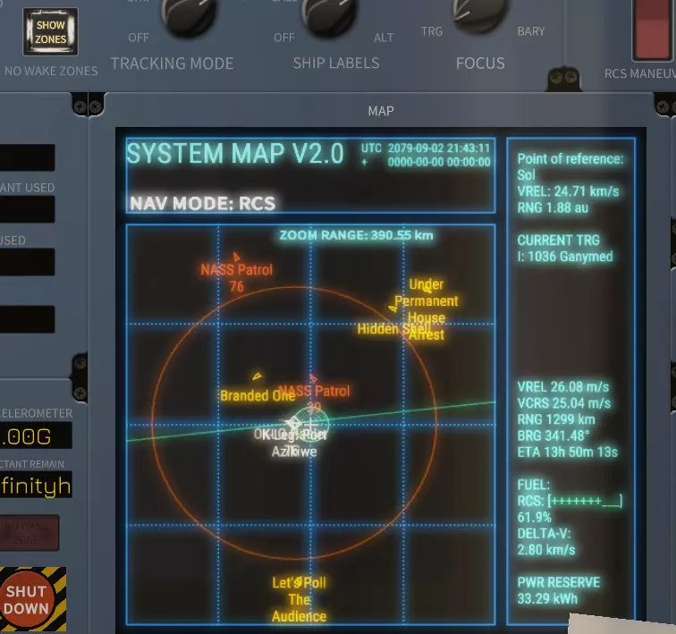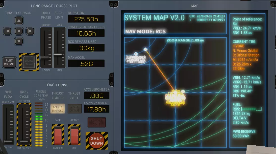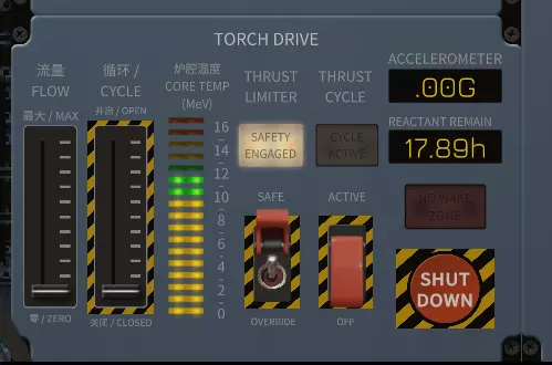 你的【流量】决定了反应速度以及燃料消耗速率。 你的【循环】表示聚变反应室向太空排出废气的开口大小。开口越大,核心温度下降得越多。 核心温度应保持在绿色范围内。 【推力限制器开关】能让你更快加速,但也会使流量增加到可能导致反应堆过热的程度,这会引发爆炸,并且在后续版本中还会引发火灾。 【循环推力开关】是实际启用聚变推进的装置,而非仅用于为电池充电。 聚变驾驶:调整【流量】和【循环】滑块,直至加速度计达到你想要的状态。记住,你的聚变引擎不一定非要全力运行才能有效,尤其是高效运行。你把那两个滑块开得越大,加速就越快,但你有时要航行多个天文单位。你的目标是慢慢加速到一个对你希望到达时间而言合理的速度,然后让反应堆空转甚至关闭来滑行。你可以使用【远程航线规划】按钮来可视化这一过程。
