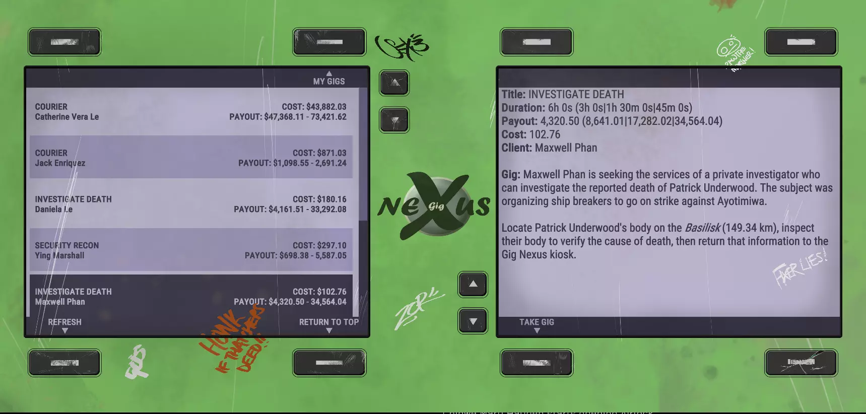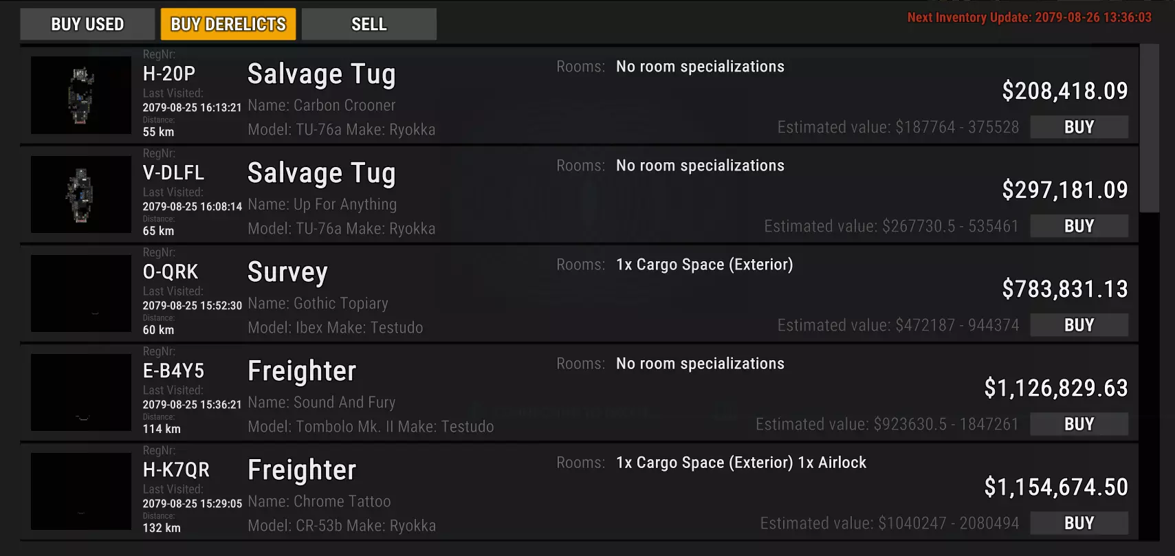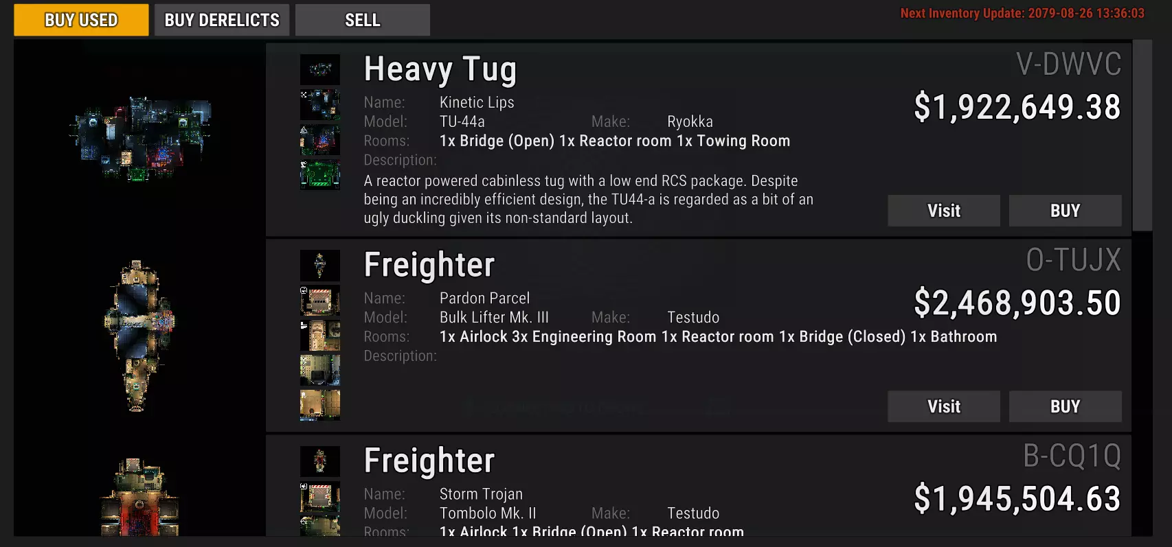 好的。这些对你这个可怜的家伙来说,确实合理得多。不过,要让它们变得宜居,需要大量的工作,而要让它们具备太空航行能力,所需的工作就更多了。 你应该注意到了,它会显示距离。这是在导航地图上确定废弃船只位置的简单方法。记住,如果你还没有登过某艘船,除了价格标签外,你可能无法获得所有信息。不过,利用价格标签可以帮助你判断哪些船只值得一探究竟。 重要提示:购买废弃船只时,其价值是按购买时的状态计算的。如果你在购买前就给船安装昂贵的设备,比如聚变反应堆、修补所有漏洞、增加房间,你会被收取更高的费用。**购买前不要修理废弃船只。**我在另一篇指南中看到的说法无法验证,仍需自行承担风险。 现在你可能会问自己:为什么我不能直接偷一艘船呢? 据我所知,那些待售的“二手”飞船停靠在空间站,即使你想偷也偷不了。另一方面,废弃飞船倒是有可能,但如果你偷了飞船——无论是废弃的,还是在扑克游戏中偷到钥匙——每次你坐到导航控制台前,都会收到“未注册用户”的警告,并且需要等待10(游戏内)秒倒计时才能使用控制台。这10秒可能关乎生死,取决于你的驾驶技术。因为要等倒计时而以200米/秒的速度撞上其他飞船可不好玩。 我该怎么赚钱呢?好吧,我不想当小偷,那我该怎么办?我该怎么赚钱呢? 我发现快速赚取启动资金的最佳方式是【任务枢纽】。这里有一些你可以做的工作,其中最赚钱的是【调查死亡事件】和【安全侦察】任务。