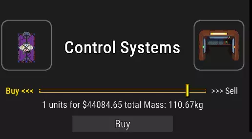 这是一个货运售货亭,位于气闸旁边。 你可以在这里购买货舱,运气好的话,也能在废弃船只上找到它们。 货舱共有三种类型:气候控制型、防辐射型和特殊型。除了特殊型兼具防辐射和气候控制功能外,其他类型的功能顾名思义。某些货物在太空中运输时需要一种或两种防护。在太空的恶劣温度下运输家具可能没什么问题,但我可不想我的食物因此变质。 一旦拥有货舱,你就能进入星系内经济系统。