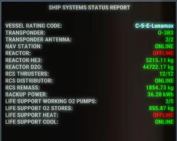 接下来我们将介绍RCS分配器,也称为RCS进气调节器。它就是氮气瓶下方的那个装置,在右键菜单中标记为“进气口”。你可以根据需要安装多个RCS分配器,增加分配器数量能让你储存更多氮气瓶,无需手动更换即可使用,这有助于增加RCS的“反应质量”(REmass)。有了它,就不必在每个推进器输入端下方单独安装气罐了。 另外需要注意的是,在紧急情况下,推进器或RCS分配器中可以使用任何气体,氮气只是成本最低的选择。 接下来是RCS推进器,在之前的图片中也能看到。你可以在飞船上任意方向安装任意数量的RCS推进器,但你会发现存在一个最佳安装位置。推进剂过多会导致加速度过大,使你失去意识;过少则需要数小时才能达到巡航速度。在你的导航控制台右下角,你会看到【机动推进器】及其节流滑块。滑块拉到最顶端时,推进器将以最大功率运行,你可以调低它以进行更缓慢、更精确的机动。导航控制台左下角有一个加速度计。即使是最健康的人,在没有药物辅助的情况下,也会在接近5G的加速度下几乎立即失去意识,所以我通常将其设为接近我的最大承受值。安装或卸载RCS(反应控制系统),直到达到这些数值。接下来,找到滑块上对应2G的位置,你应将其视为最大持续推进功率;最后,找到1G的位置,这可以作为你的舒适操作区间。然后多尝试一下,看看你的角色实际会做什么。你会发现他们在高G过载时开始失去意识。 电池:这是一个简单的组件,大部分功能不言自明。我写这段是为了给你一点建议。在撰写本指南时,电池系统存在一个bug限制,即它们只能通过【输出】箭头(安装时的插头连接器)进行充电和放电。此外,电力系统一次只能为4个电池充电和放电(使用聚变反应堆时)。我认为你可以安装更多电池,它们会在需要时被使用,但你会开始看到充电水平不均匀,不过我还没有测试过这一点。 那么建造或修复飞船呢? 情况很好:你找到了一艘你想修复的废弃飞船。以下是你需要执行的要点: 1. 检查飞船是否有入侵者。你可能不是船上唯一的人。我遇到过入侵者被困在破损门后的情况,所以我会等他氧气耗尽后再拆除那扇门,否则就要准备战斗。同样,你在梅斯卡福姆的朋友可能会在这方面帮到你。 2. 在飞船各处检查各种组件的状况。默认按X键可进入新的【状态视图】,这对你会有帮助。只需进行X射线扫描,找出地板上的缺口,记录缺失的墙壁,总体判断是修理飞船更容易还是搜刮飞船更容易。如果某个组件显示为【受损】,则需要更多工作以及零件等来修复它。 3. 恢复电力。使用之前指南中提到的动力VIS显示屏。从电池开始,在每个电力中断的地方添加EMT导管。通常这样就能为一些灯和空气泵供电。 4:一旦导航控制台通电,就去坐在那里。点击【打印状态】。这会让你了解飞船的整体情况以及任何缺失的组件。一开始不必担心反应堆或除RCS之外的任何储罐,但同样,应答器是最重要的东西。没有应答器,你就无法停靠任何空间站。 5:接下来,我喜欢密封地板。在X光视图和普通视图之间切换有助于找到缝隙。墙下面不一定需要地板,但这样做确实能让改造更轻松。6:检查飞船外部组件,或者确保你有无需给飞船减压就能外出的方法,比如一个次级气闸(两扇门可以当作气闸使用,但它们完全是手动的,而且你的角色不太会随手关门)。再次强调,X光很有用。 7:在缺失墙壁的地方添加墙壁。 8:是时候增压了。分阶段进行是明智的做法。你首先应该做的,尤其是在修复废弃飞船时,是四处走走并仔细检查墙壁。有一种名为【空气通风口】的组件,你可以手动关闭房间之间的通风口。我花了很长时间才发现自己漏掉了一个,所以在逐个房间增压时,要再四处检查一遍,找到它们并关闭。你会看到气体逸出的地方形成淡淡的白色云团,但你必须仔细观察才能发现。 9:既然你已经有了加压飞船,就可以开始修复组件和安装缺失的组件了。这里有一份关于房间类型的指南,了解这些能提升你的飞船价值。如果你想倒卖飞船,这会很有用。 10:整个太阳系任你探索。记住,在建造飞船时,下一次更新将引入火灾机制,你在设计飞船时可能需要考虑这一点——火焰无法在真空中传播,而且可能也不容易穿透墙壁。 你可以查看这份与上述内容大致相同但更深入的指南。感谢【Boner Storm】建造你的聚变反应堆 注意:由于聚变系统是新机制,我目前仍在学习中。你可以随时通过ESC菜单查看游戏内手册。