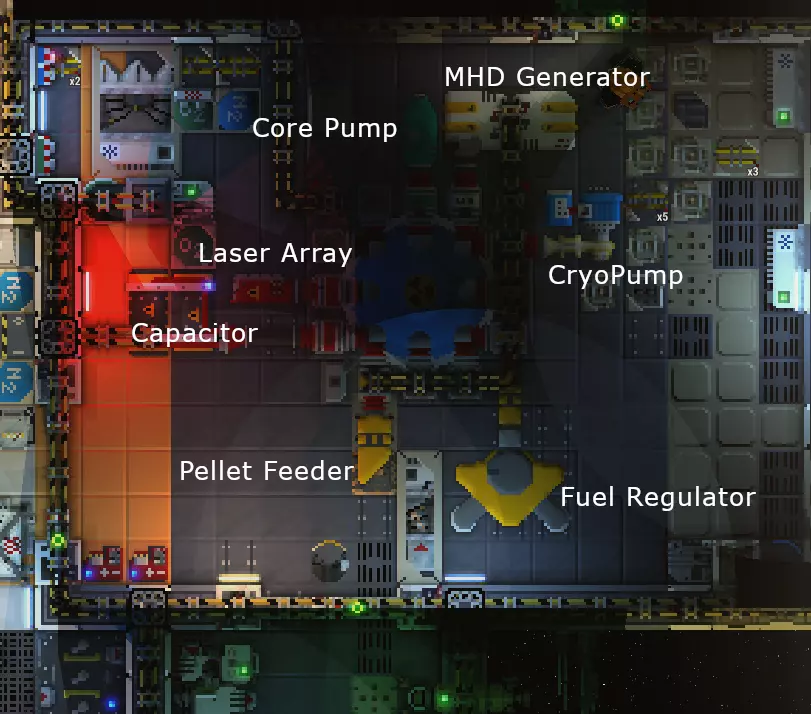 你可以查看面板左下角,那里有一个实用的清单,列出了你所需的所有物品! 开始建造:(本部分末尾有图片) 首先,你需要以下物品(这里指的是零散组件): 2个【磁场线圈组件】 4个【集成电路聚变核心】 此外,你至少还需要以下物品中的1个: 【核心泵】† 【聚变级激光电容器】** 【聚变激光阵列】 【 pellet 送料组件】 【低温分配泵】† 【反应堆燃料调节器】 【磁流体动力(MHD)发电机】 【液氦罐】 【重水罐】 【低温罐】† **关于聚变电容器的注意事项:它本质上是一个微型电池,能提供启动反应所需的初始“动力”。我安装该组件时,它最初会导致电池电量快速消耗,如果我没有从同一艘船上找到另一块电池,我可能就会被困住。我的建议是在空间站安装这个组件,然后将反应堆的【电源总线】切换到【电池】模式,等待电池不再有明显的电量消耗(此时激光电容指示灯会显示就绪状态)。如果电容耗尽了你的主电池组,你随时可以在空间站补充电量。这可能只在你的电池组容量较小时才会成为问题。你可以配备多个激光和电容,每两个激光需要搭配一个电容。从技术上讲,启动聚变反应并不一定需要核心泵。你可以通过“在真空中打开循环滑块,直到显示真空状态”来跳过核心泵,但这样做会导致飞船移动。低温装置用于在无需手动监控的情况下维持核心温度,也可以通过打开排气装置来降低温度。个人不建议在没有低温装置的情况下运行,爆炸的后果很严重。 你也可以安装多个 pellet 进料器(pellet feeder)和燃料调节器。一个调节器可以为两个进料器供能。 使用多个激光器/进料器可以让你消耗更多燃料,从而加快燃烧速度。