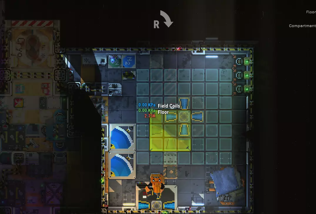 你需要大量空间。首先安装场线圈,安装后你会看到它周围有一个禁区。你实际需要的空间甚至比图片所示的还要大。另外注意,场线圈的中心不能有地板,必须暴露在太空中。不用担心,安装后它会起到地板的作用。 放置第一个场线圈后,你会自动去拿第二个。 接下来安装反应堆核心。它必须放置在场线圈的正上方。和之前一样,你会自动去拿剩下的三个零散组件。其余组件将连接到反应堆周围的连接点,它们的排列方式无关紧要,只要反应堆图标必须在该连接点与反应堆接触,并且磁流体发电机(MHD)需要电力通过电力图标即可。请记住,你将无法“跨越”大多数这些组件,因此进行维修时,你需要额外的空间来走动。