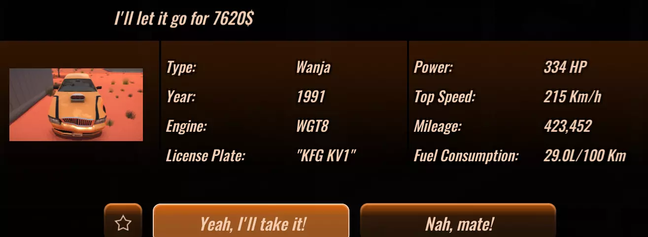 无论你是否参加比赛,你都可以随意处置这辆车。在这个例子中,我们先留着它。你可以选择修理它,也可以不修,如果你愿意的话还可以卖掉它。 游戏的核心玩法来自报纸。打开报纸,查看上面的车辆信息。这些车辆是随机出现的,你会看到各种各样的选择。刚开始,我建议你寻找“高里程”“生锈”或“二手”且价格便宜的车辆,最好在1万美元以下。以我为例,我花7620美元买了一辆高里程的万贾特别版。