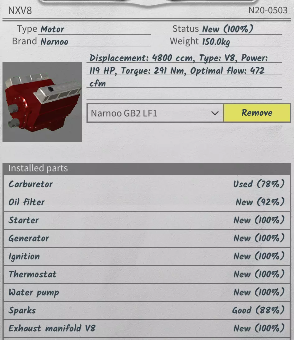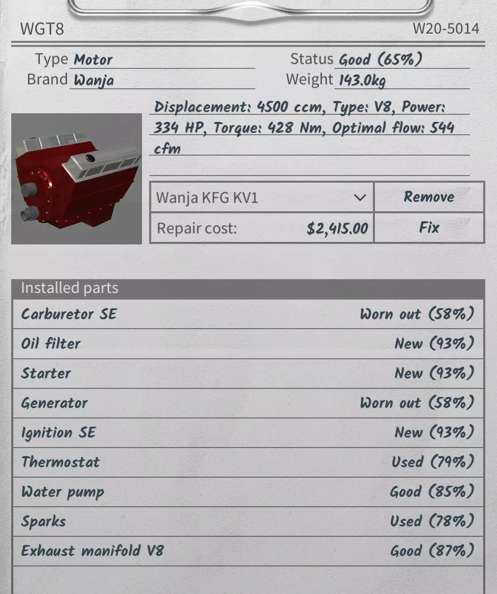 状态良好(65%)。修理缸体得花点钱,但还是修吧。你可以修理其他部件,但现在我先处理缸体。不过等一下,我们还有一个增压器。来检查一下!