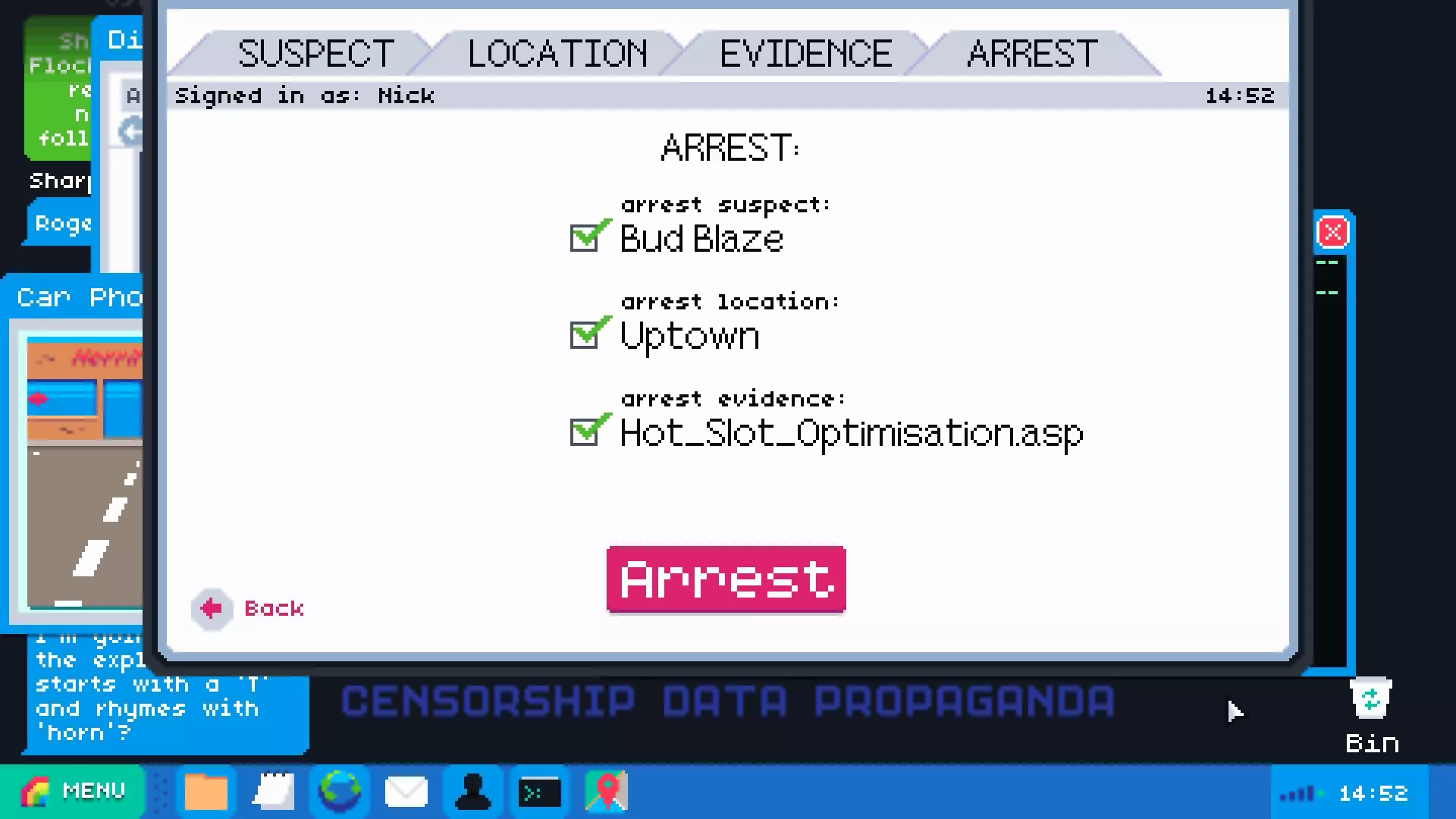 案件三 - 十五年刑期 若你将鼠标悬停在黑点上,逮捕界面将会显示,告知你嫌疑人的姓名、所在位置以及获得十五年定罪所需的证据。