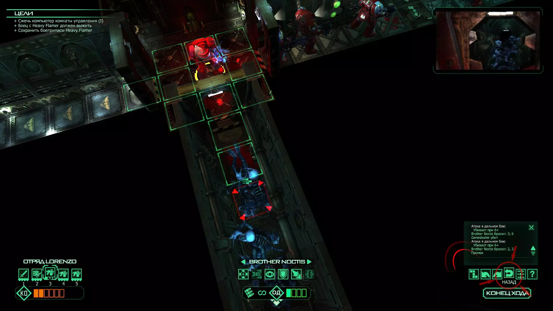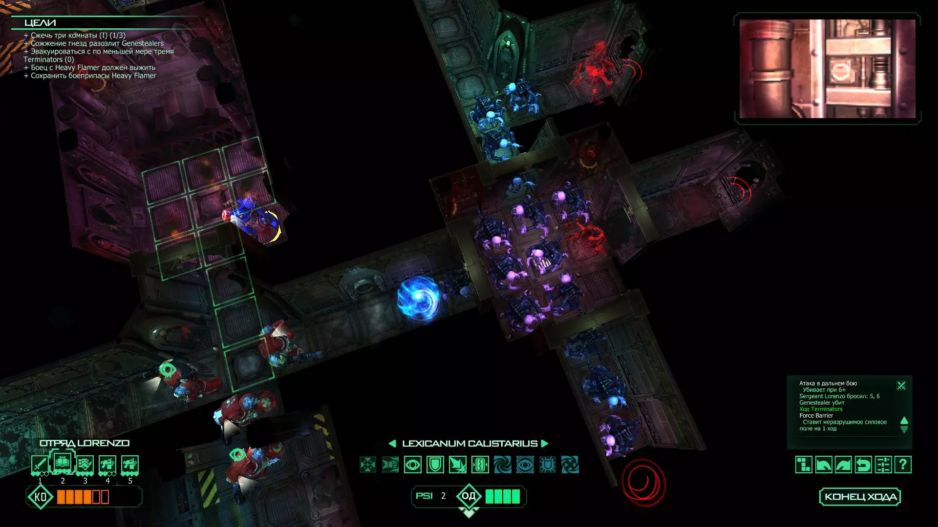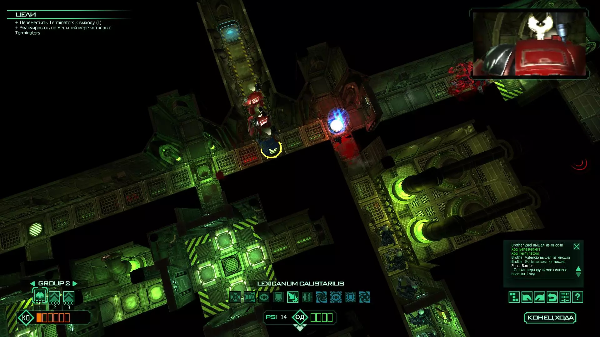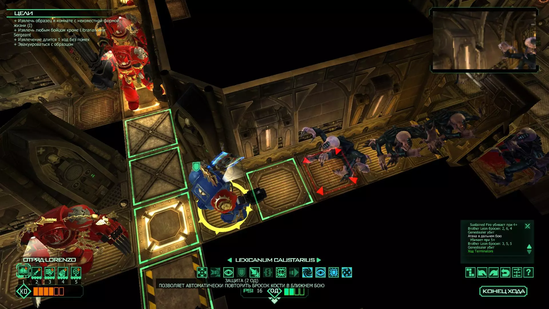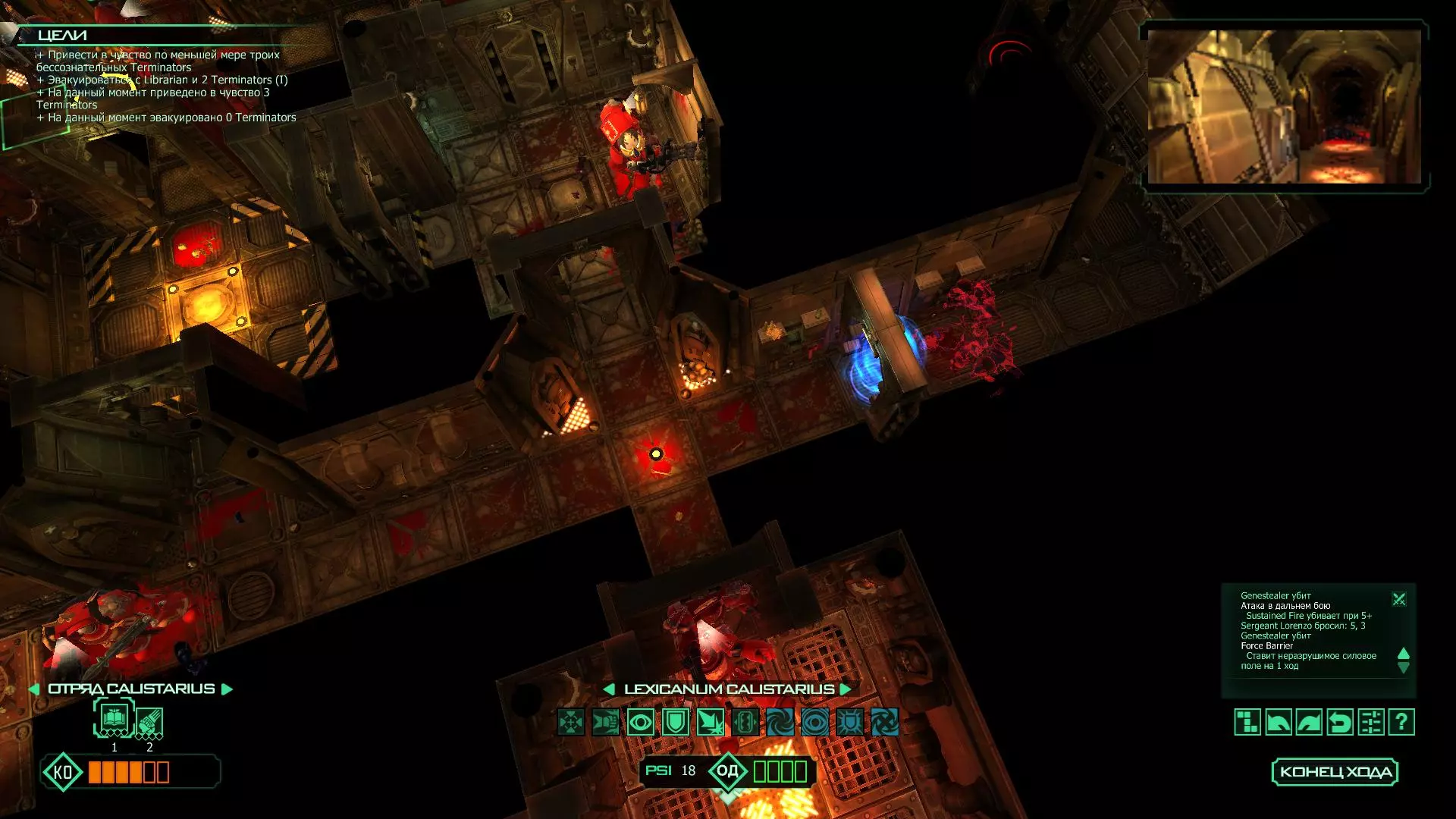扎埃尔兄弟能很好地守住一个方向,而断后的卡利斯塔里( Калистарий )则负责另一个方向(是的,要达成成就需要他存活下来,但这并不意味着要极力保护他,因为他可以轻松地设置能量屏障,而且只要他还有灵能,他就是不可战胜的)。 不要忘记“返回”按钮,它能帮助你有效地对付基因窃取者和破解门。