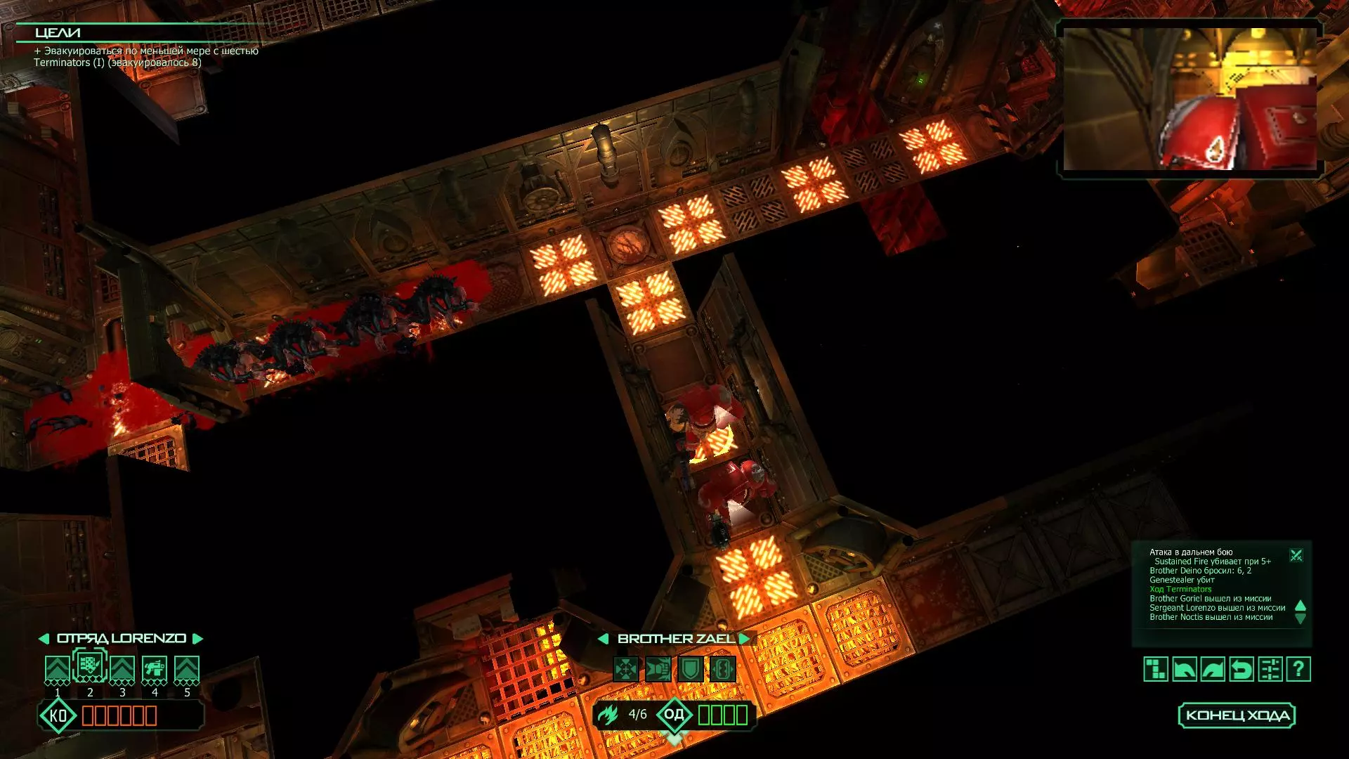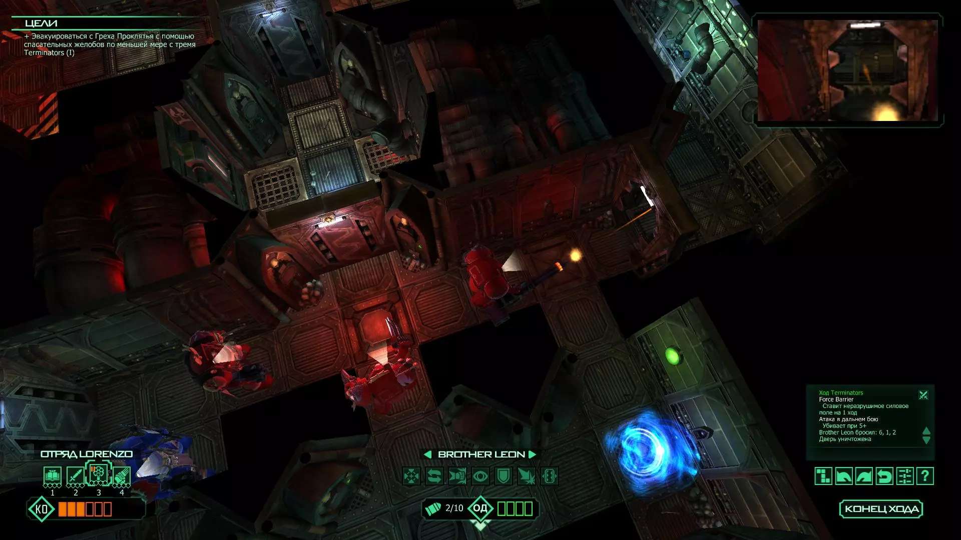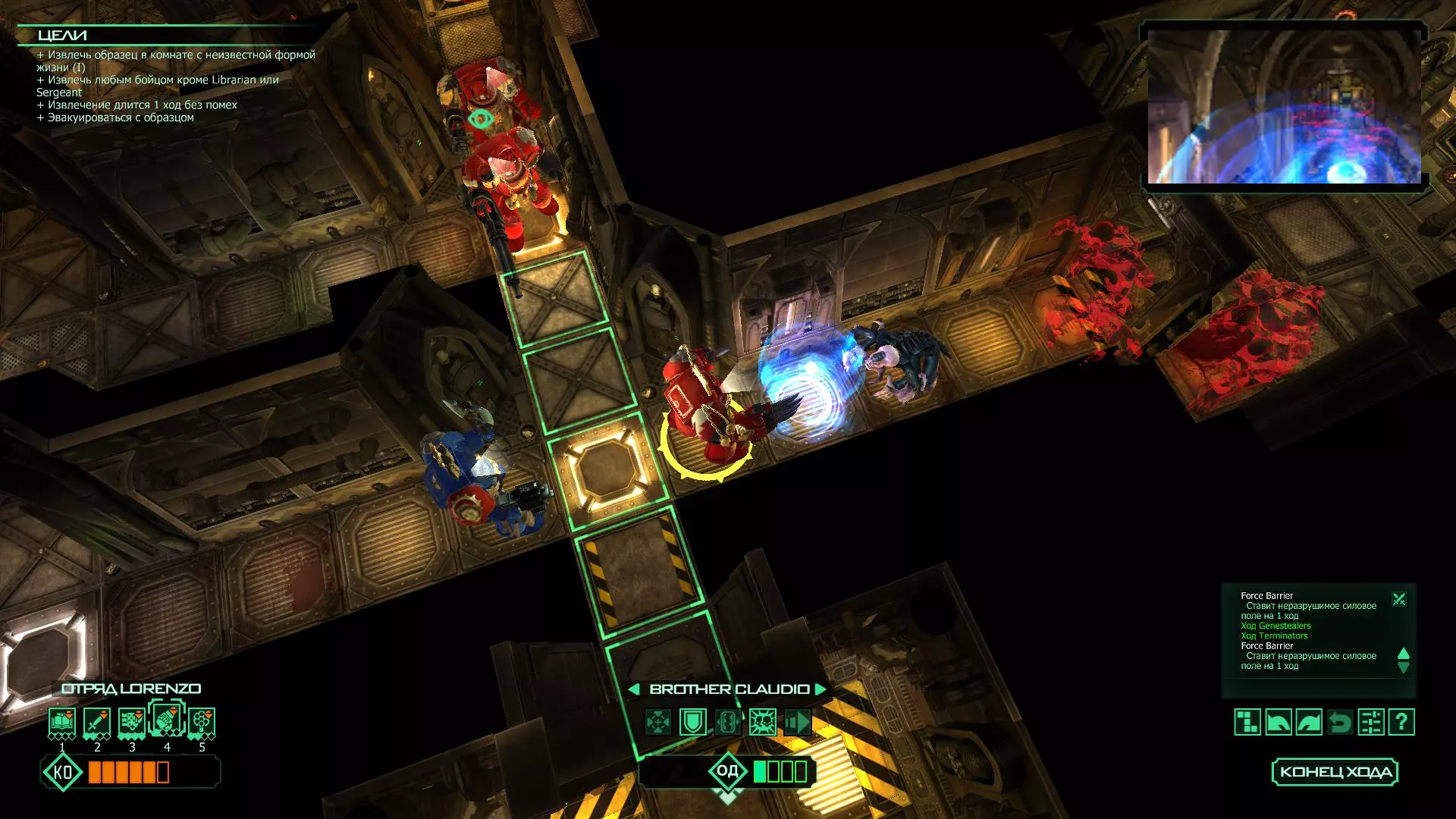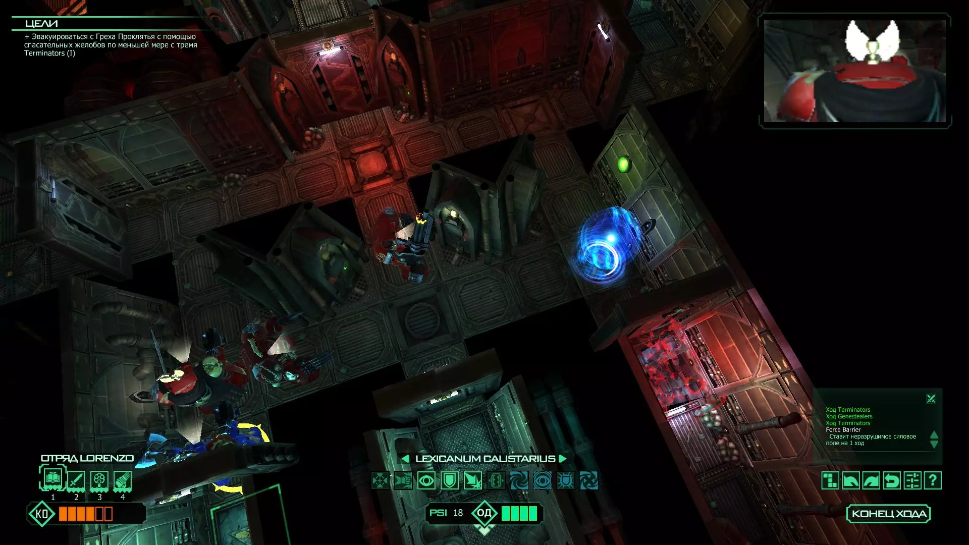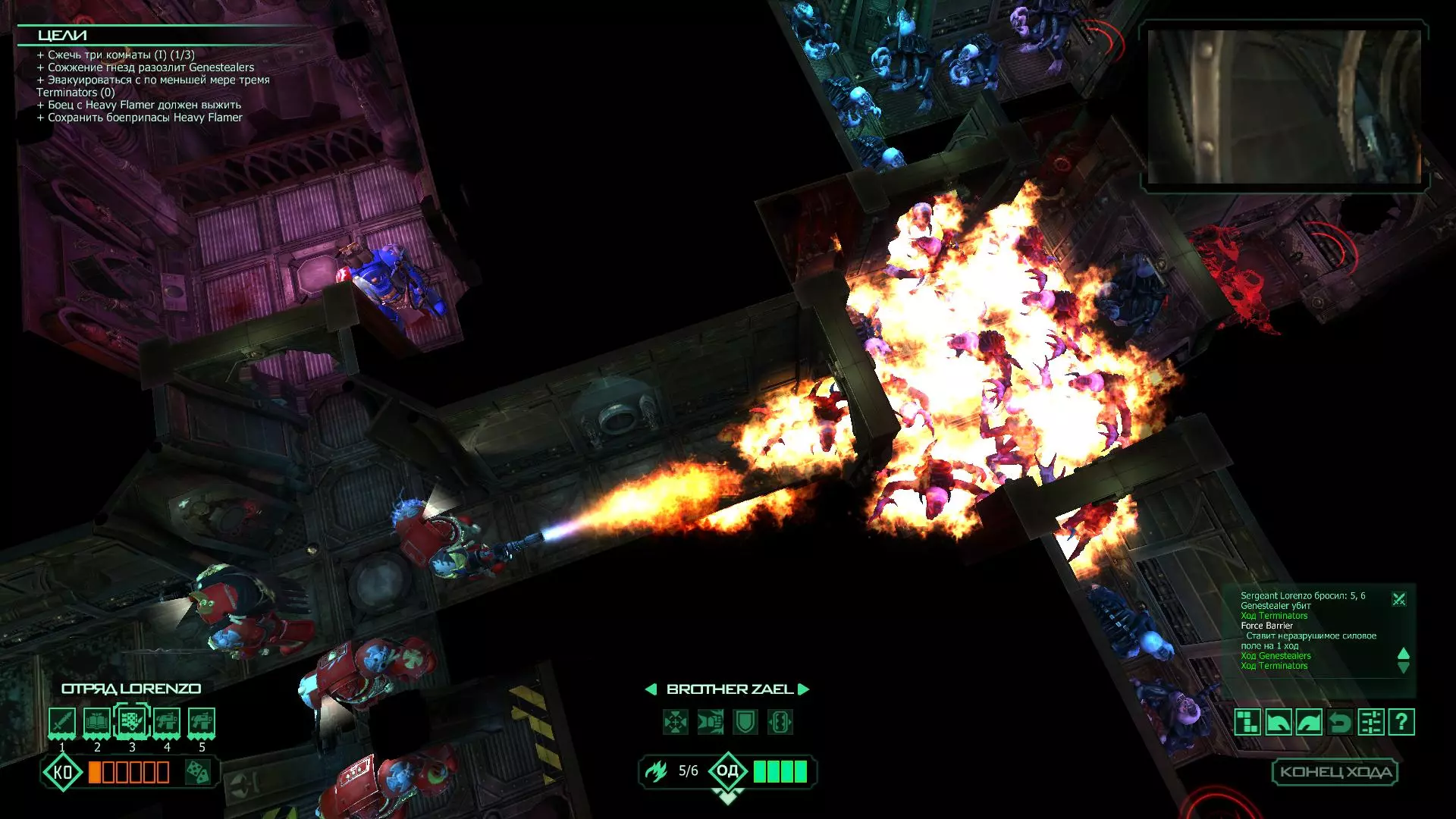 扎埃尔兄弟能很好地守住一个方向,而断后的卡利斯塔里( Калистарий )则负责另一个方向(是的,要达成成就需要他存活下来,但这并不意味着要极力保护他,因为他可以轻松地设置能量屏障,而且只要他还有灵能,他就是不可战胜的)。 不要忘记“返回”按钮,它能帮助你有效地对付基因窃取者和破解门。