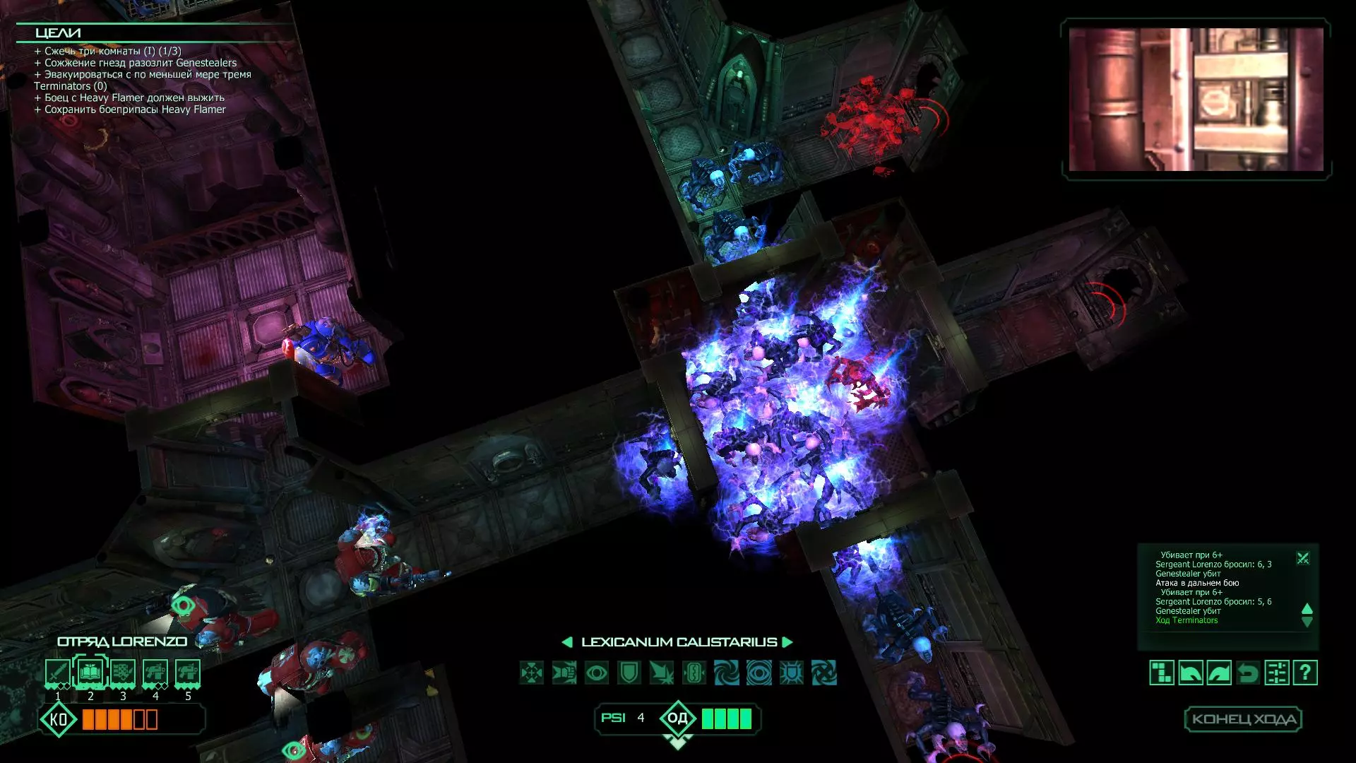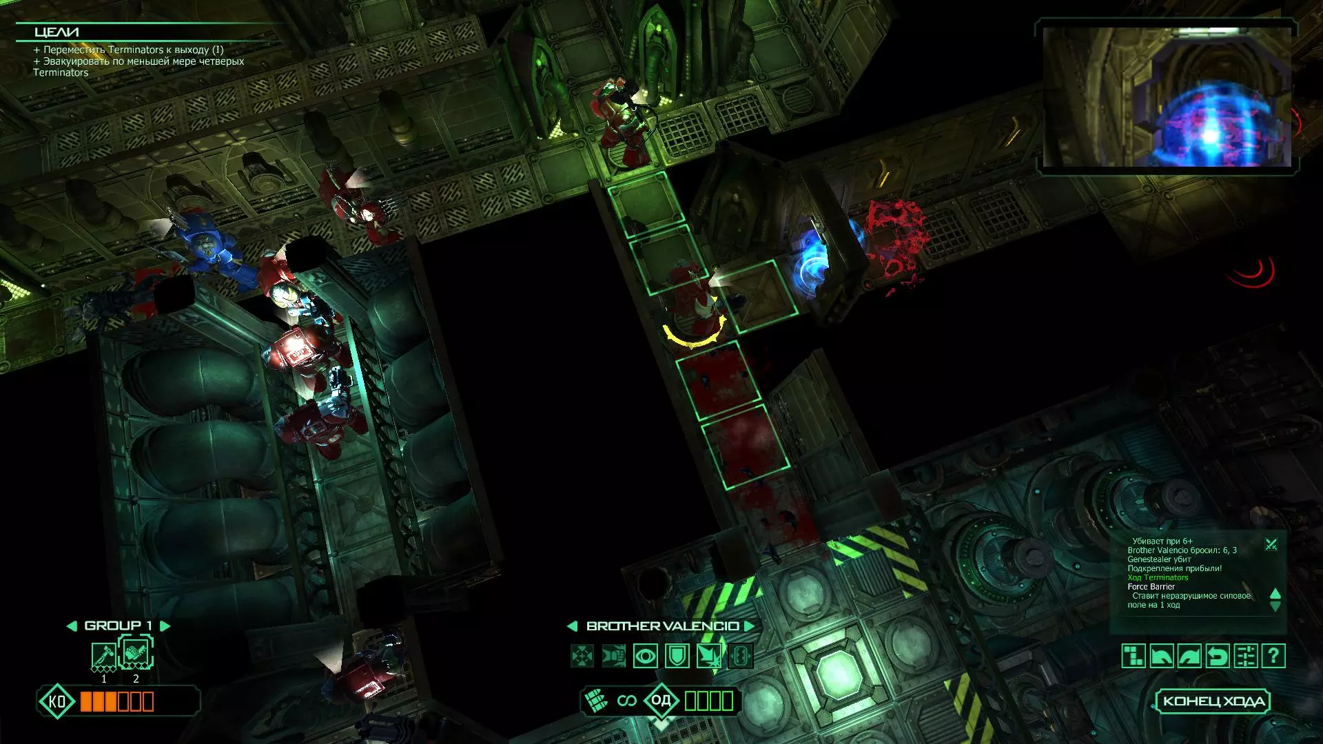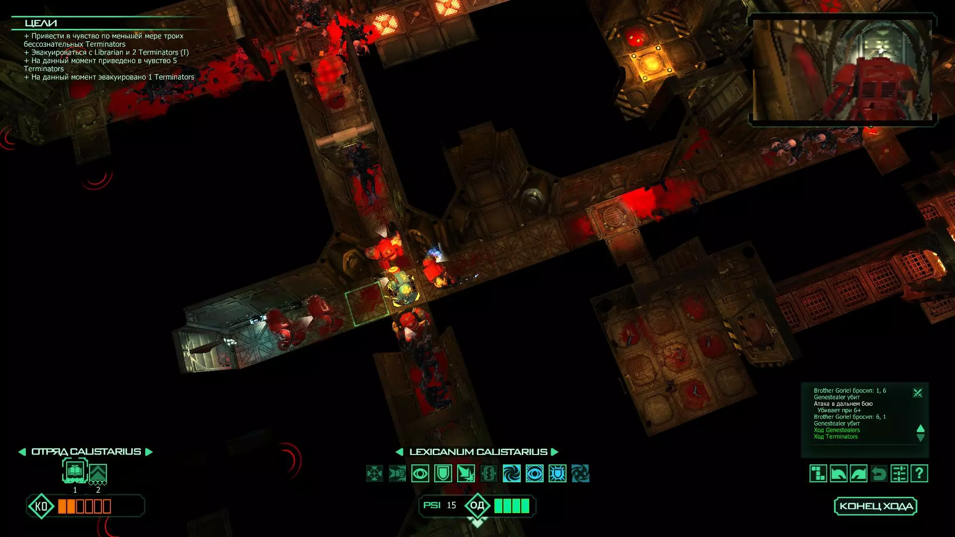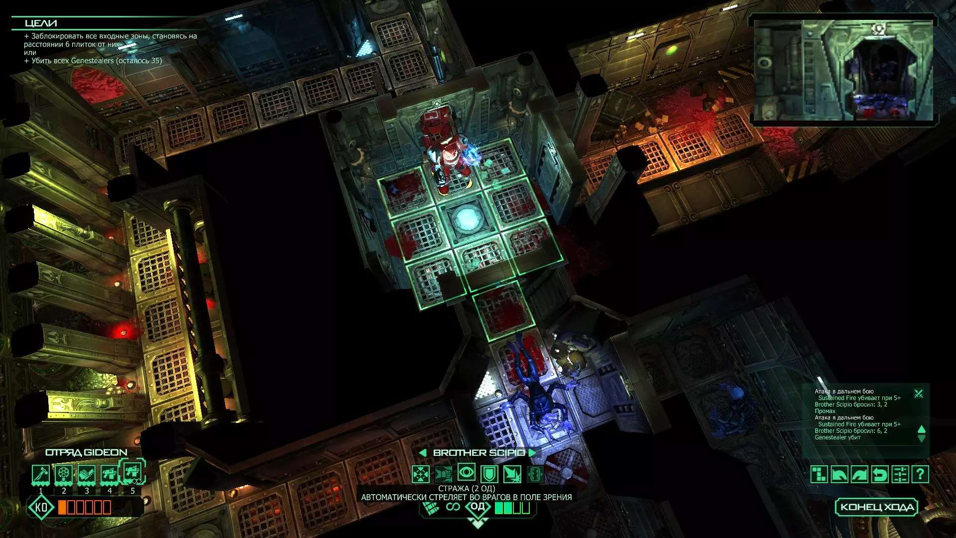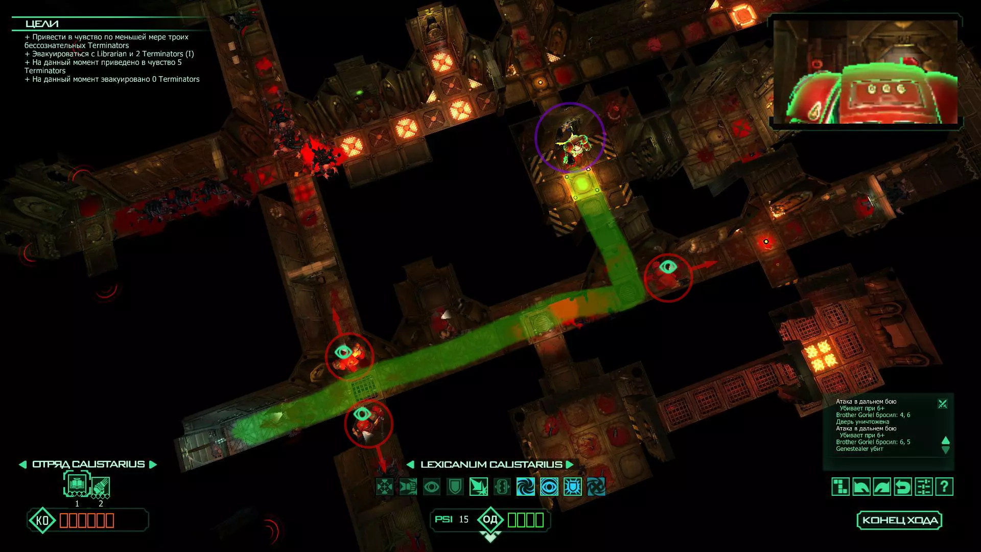 扎埃尔兄弟能很好地守住一个方向,而断后的卡利斯塔里( Калистарий )则负责另一个方向(是的,要达成成就需要他存活下来,但这并不意味着要极力保护他,因为他可以轻松地设置能量屏障,而且只要他还有灵能,他就是不可战胜的)。 不要忘记“返回”按钮,它能帮助你有效地对付基因窃取者和破解门。