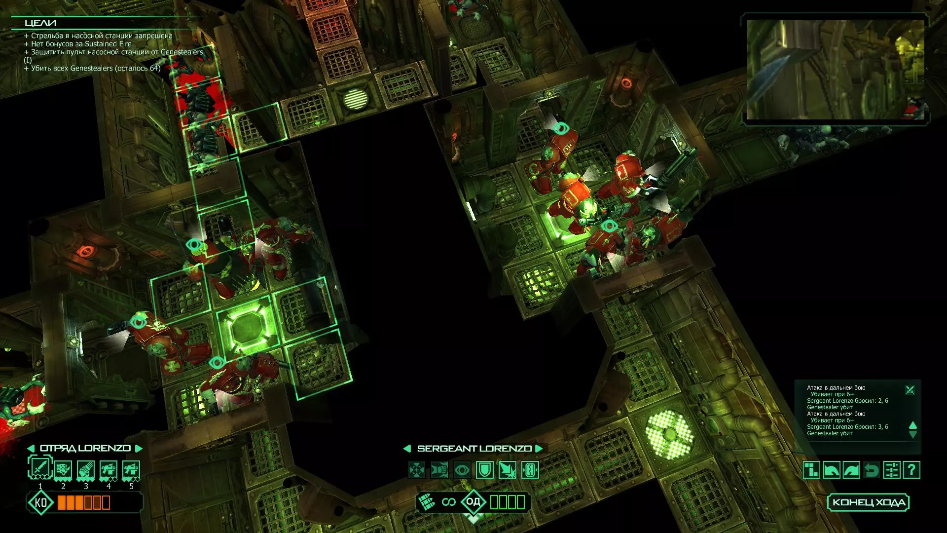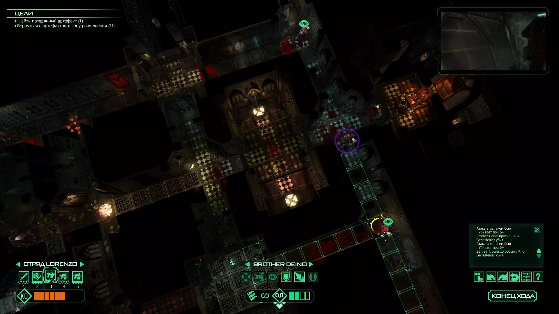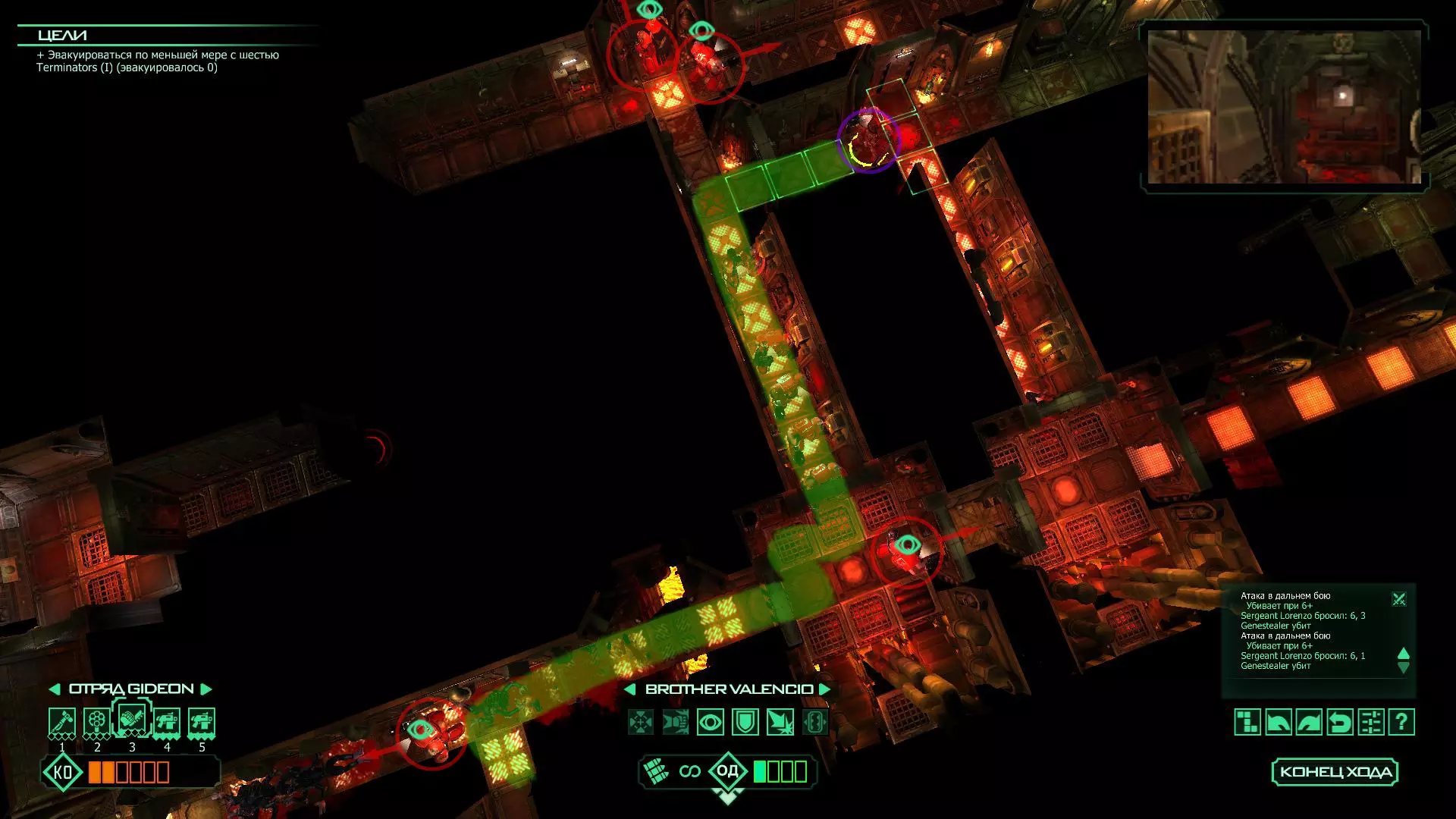 洛伦佐中士负责坚守前线,图书管理员负责后方,侧翼可以直接用能量场封锁,因为敌方首领在接下来的几个回合内就会出现,而且无论如何,用于击杀他的灵能点数都是足够的。 一旦敌方首领出现,就让图书管理员用链锯剑将其击杀。