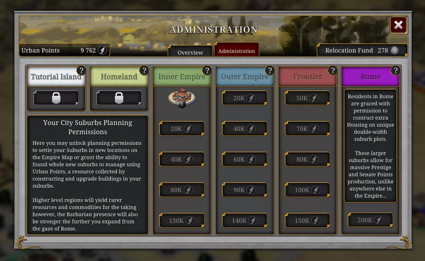驱逐 城市领袖可以选择将玩家从郊区(城市)中驱逐。 这种情况大多发生在不活跃的玩家身上。 我的建议是,保持活跃,这样你就不会遇到这种情况! 迁移郊区或获取新郊区 点击你的城市点数图标,打开城市郊区概览。 此界面将显示你迁移和建立新郊区的所有选项。 你可以在本土范围内免费迁移一次郊区。 只有当你迁移到内帝国后,才能建立第二个郊区。
