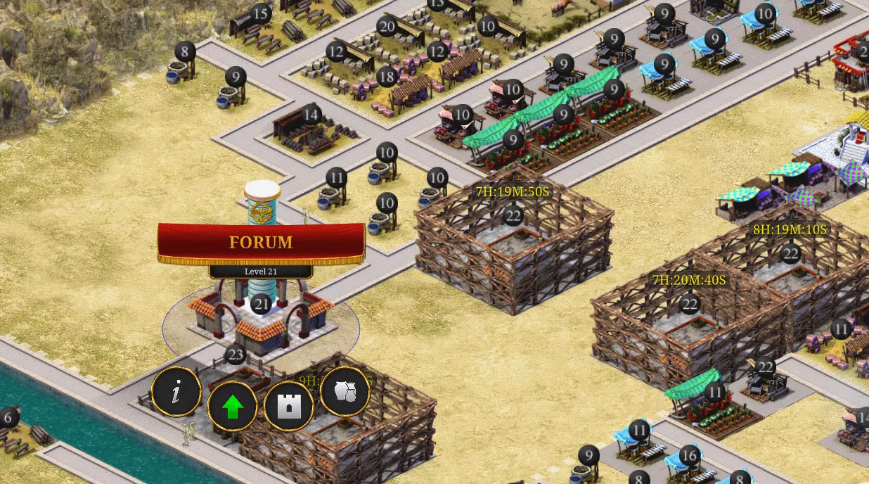 论坛 论坛是您城市的支柱,您可以在那里储存所有资源和银币。 升级论坛可以增加您在那里储存的银币数量(来自税收)和工作许可。