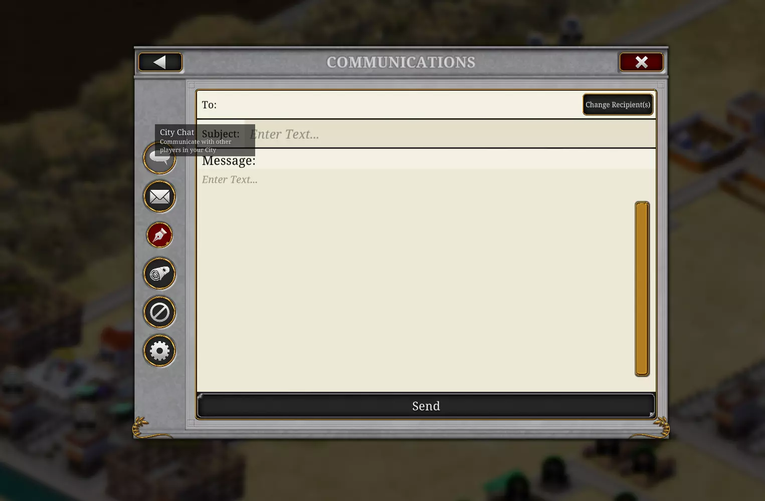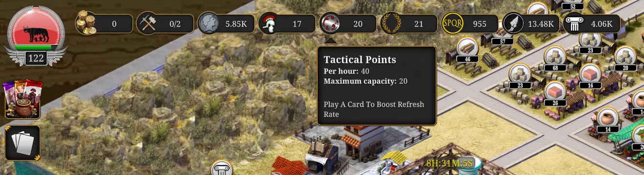 如果你需要银币、声望、政令点、影响力点,或是想提升资源产量……卡牌会是你的好帮手。 交流 交流在《罗马:凯撒时代》中扮演着非常实用且有帮助的角色。 我强烈建议你使用城市聊天功能,这样你就能与城市中其他15名玩家进行交流。 例如,当你提升木材产量时,向其他城市成员 announce 这一情况,这样你们双方都能获得更多木材。