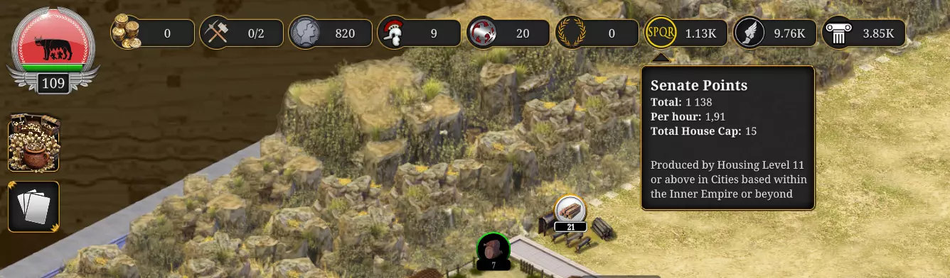 元老院中的每个席位都会消耗你的SPQR,随着你的发展深入,席位成本会上升(你的元老院席位等级越高,每小时消耗的SPQR就越多)