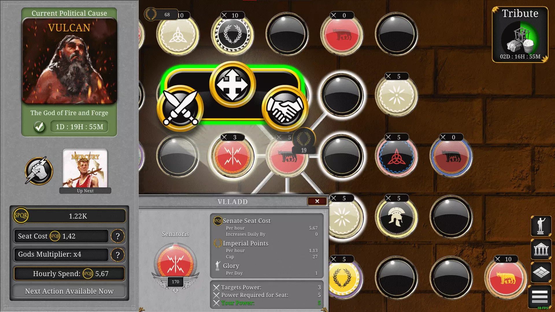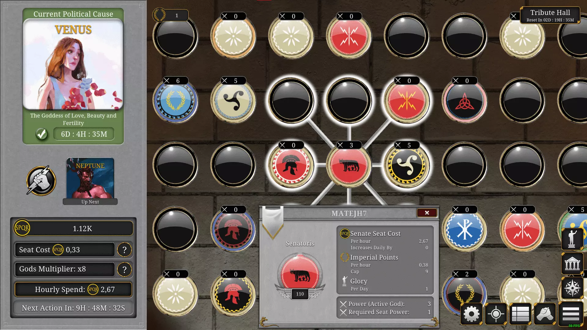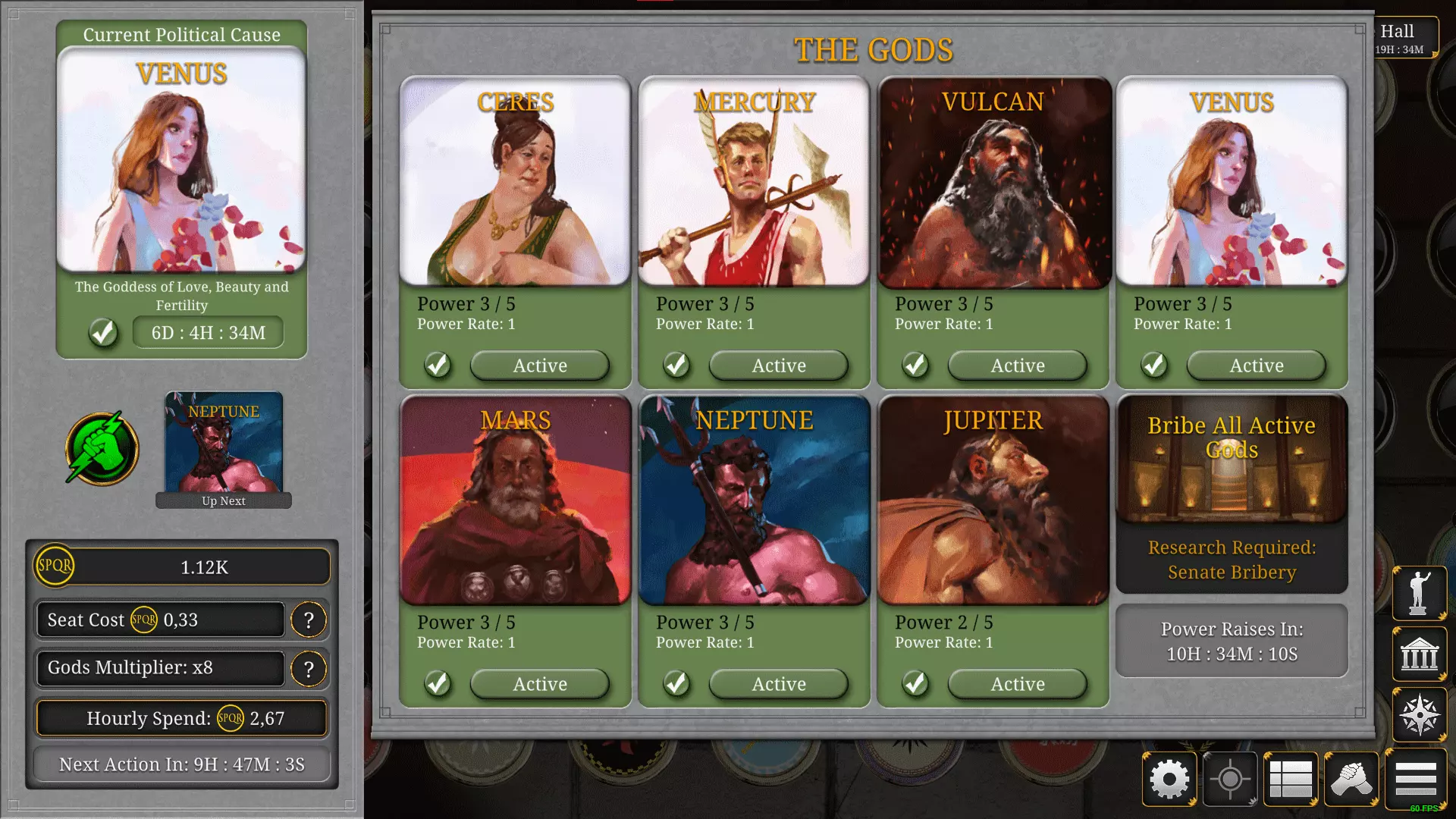 你激活的神明越多,在元老院中的席位消耗的SPQR就越多,但你将获得更多IP!