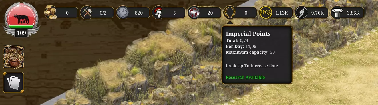 战术点最大容量为20。 战斗中,每部署一个小队或消灭一个蛮族小队,可额外获得1点战术点。 帝国点 帝国点用于在帝国地图上占领资源城镇和蛮族要塞。 帝国点也可用于与城市进行资源的进出口。 帝国点会随时间缓慢生成。