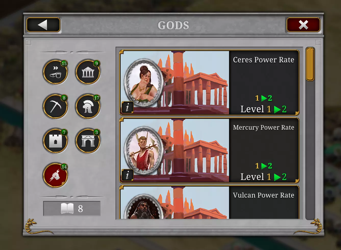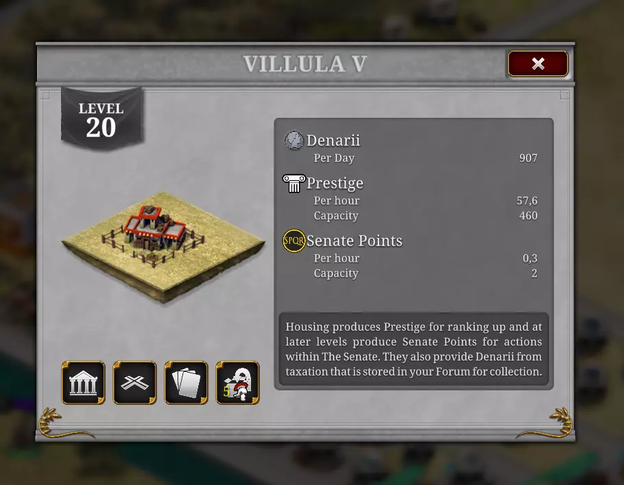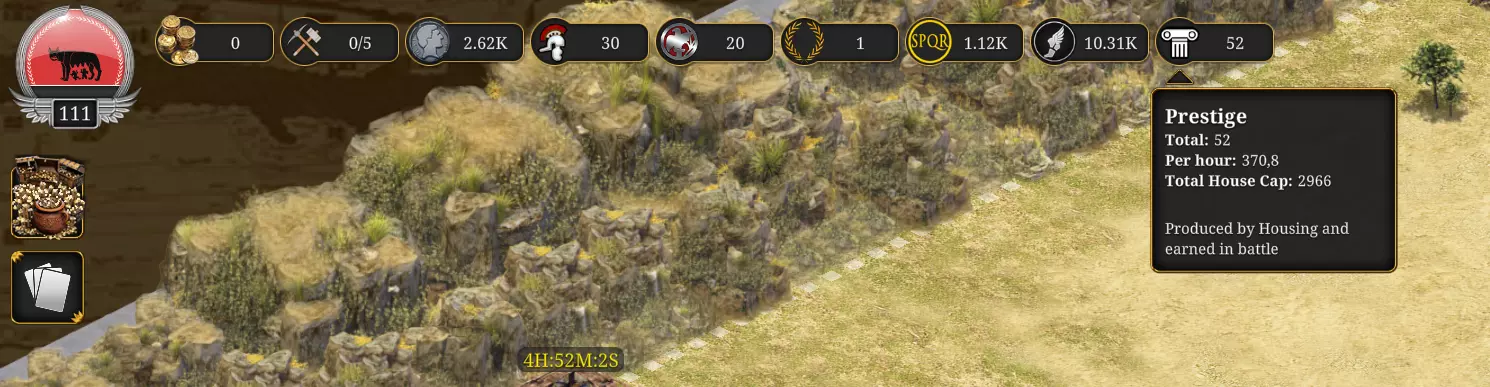 激活每个神明都会使你的每日消耗增加100%,所以要谨慎行事! 声望 声望由房屋产生,房屋等级越高,获得的声望就越多。 升级需要声望。