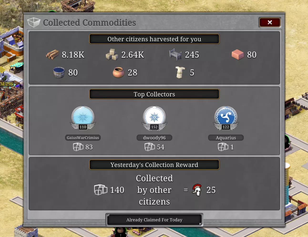 你将获得他们收集的资源,还会获得一些【CP】!所有这些都将在第二天你打开并登录游戏时发放。这真是来自其他市民的一份不错的见面礼。