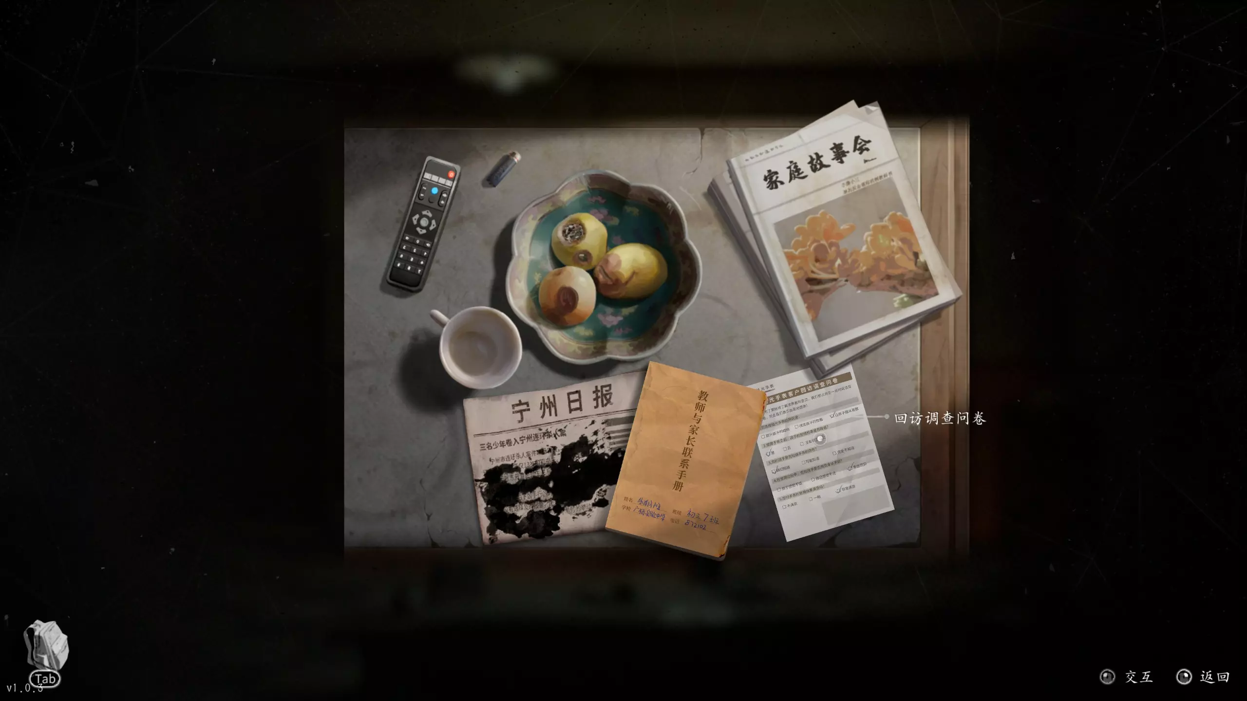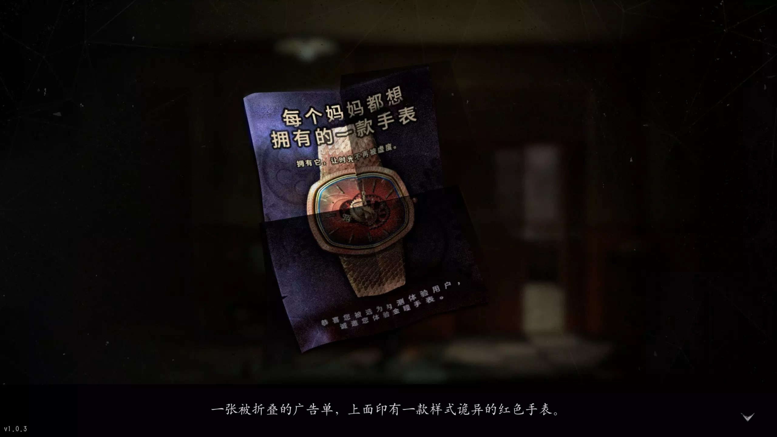金瞳手表 【第一章】妈妈-小节四中查看了电视柜里被折叠的纸(广告单)以及桌子(茶几)上的回访调查问卷,在【第一章】妈妈-小节五中用钥匙进入了妈妈的卧室并打开箱子内的密码盒。