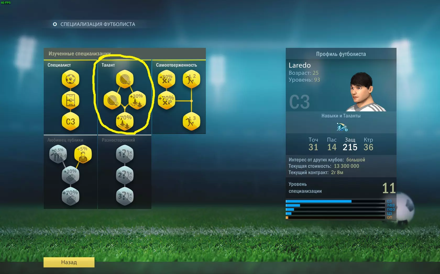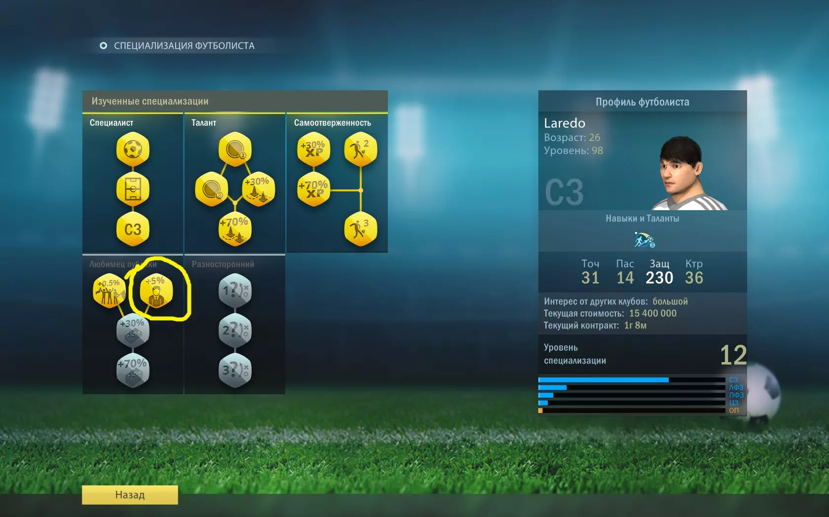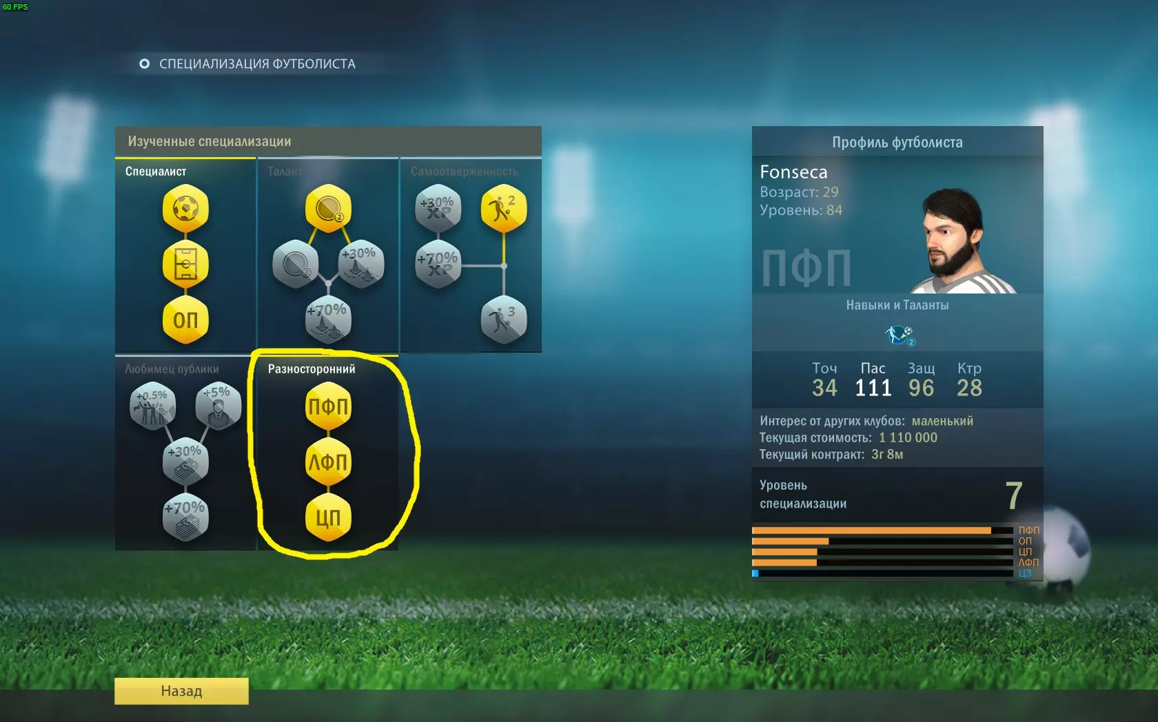 全能型 学习“全能型”专精的全部分支。 专精点数通过特定位置球员的成功行动获得。 需要在不同位置各达到1级专精。提升特定位置的等级后,你将能够在“全能型”专精分支中学习该位置。例如:防守型中场(ОП)、中前卫(ЦП)、左中场(ЛФП)、右中场(ПФП)。