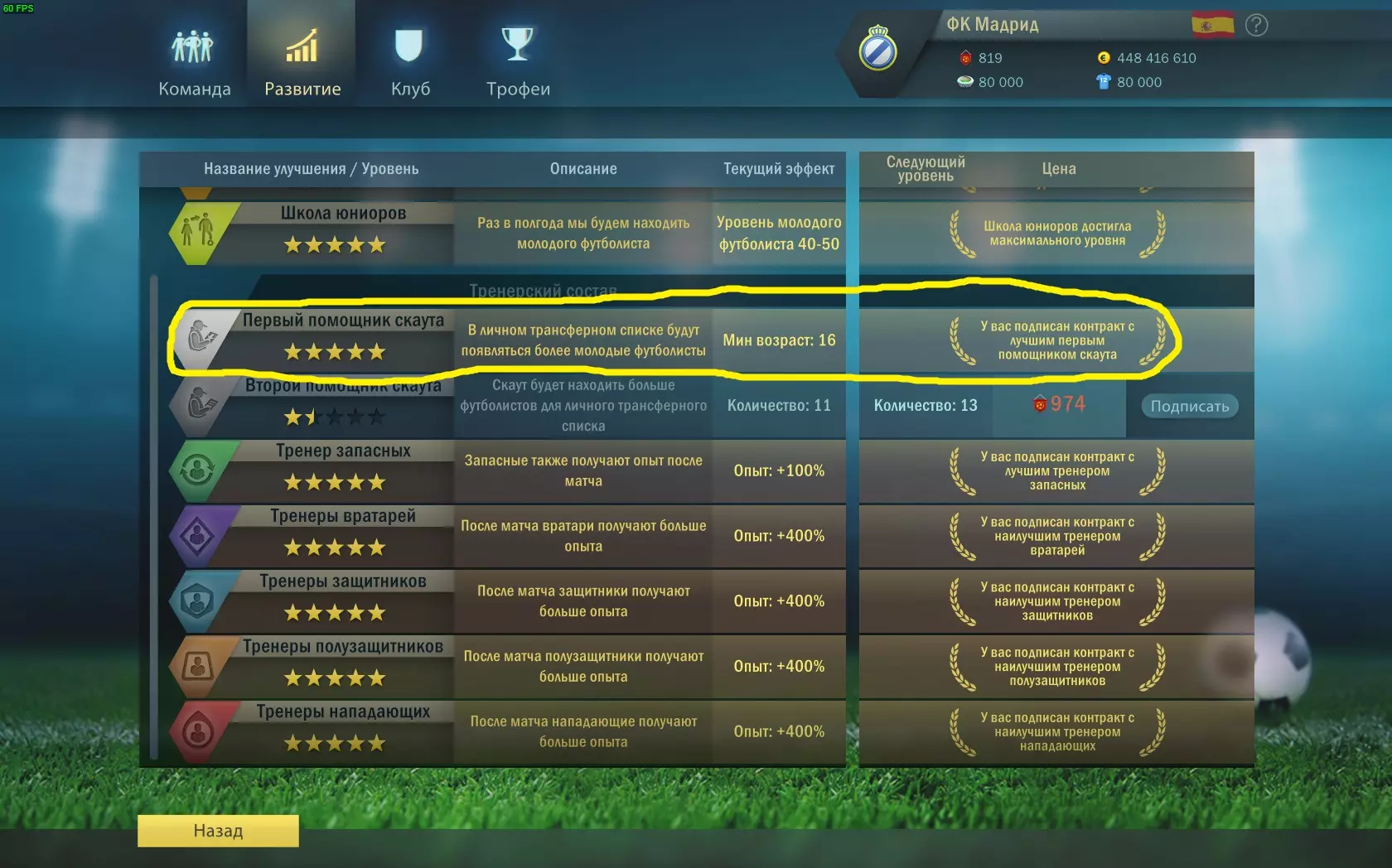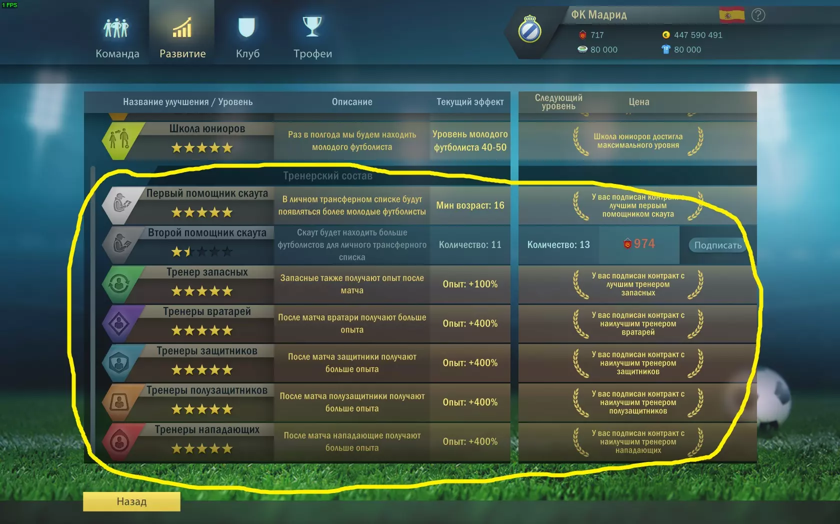 奖杯拥有者:成为所有联赛、声望杯和国家杯的冠军。 球队培养: 守门员(GK)- 属性【防守】,技能【出击扑救】、【强力门将】和【长传】; 后卫(左后卫、右后卫、边后卫、中后卫、清道夫)和防守型中场(DM)- 属性【防守】,技能【拦截】、【反应】和【长传】; 中场(左中场、右中场、后腰、攻击型中场、中前卫)- 属性【传球】,技能【一脚传球】和【长传】; 前锋(边锋、中锋、左前锋、右前锋)-参数【精准度】和【控球】,技能【假动作过人】、【推射】和【头球争顶】。联赛方面,要逐步提升球队实力。联赛等级越高,你获得的经验和资金就越多。建议从业余联赛到顶级联赛逐步争取胜利,不要跳过晋级机会(例如获得第二名从而升入下一级联赛)。 【声望杯】——所有业余联赛、第三联赛和第二联赛的球队均可参加此项杯赛。国家杯 - 该杯赛对所有甲级联赛和超级联赛的球队开放。 可在【技巧】板块查看获胜情况。 在奖杯陈列室可以追踪已赢得的奖杯。