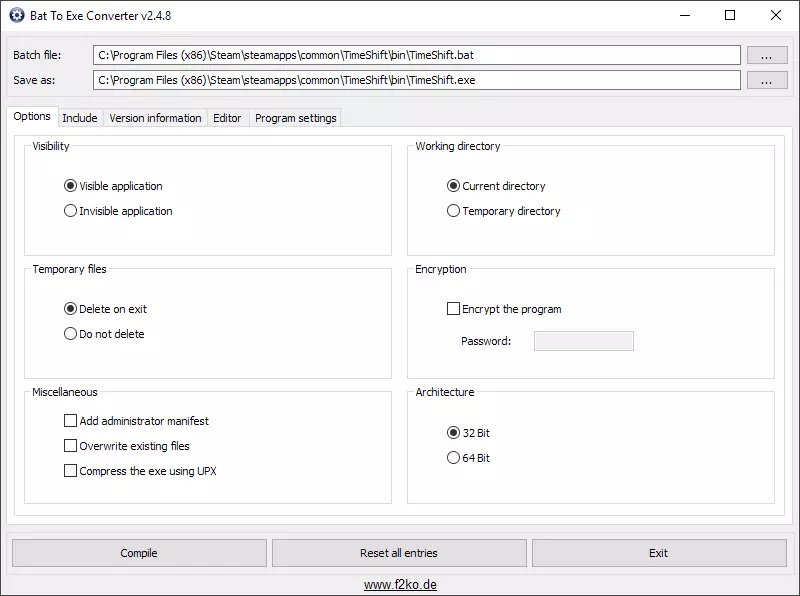 从这里开始有两种选择。第一种是从桌面快速启动游戏的方式,第二种可以通过Steam启动游戏(第二种方式也能用来创建桌面快捷方式)。第二种方式会多花一点时间,但考虑到其灵活性,我仍然推荐使用。 选项一:创建桌面快捷方式 这是一种非常快捷的方法。 右键点击“TimeShift.bat”,选择“发送到”→“桌面(创建快捷方式)”。 快捷方式图标有点单调。如果你想的话可以更换图标,但这里就不详细说明了,你可以自行搜索相关方法。 选项二:通过Steam运行游戏 这个过程可能会让你感到困惑,我会在本指南的最后解释其原理和操作方法。 首先,将.bat文件转换为.exe文件。我推荐Bat转Exe转换器,但你可以使用任何你喜欢的方法。 如果你选择使用此程序,请安装并启动它。 选择你创建的.bat文件。确保生成的exe文件将放置在游戏目录的【bin】文件夹中,并命名为【TimeShift.exe】。 保留所有其他设置不变。 你的屏幕应该显示如下内容: