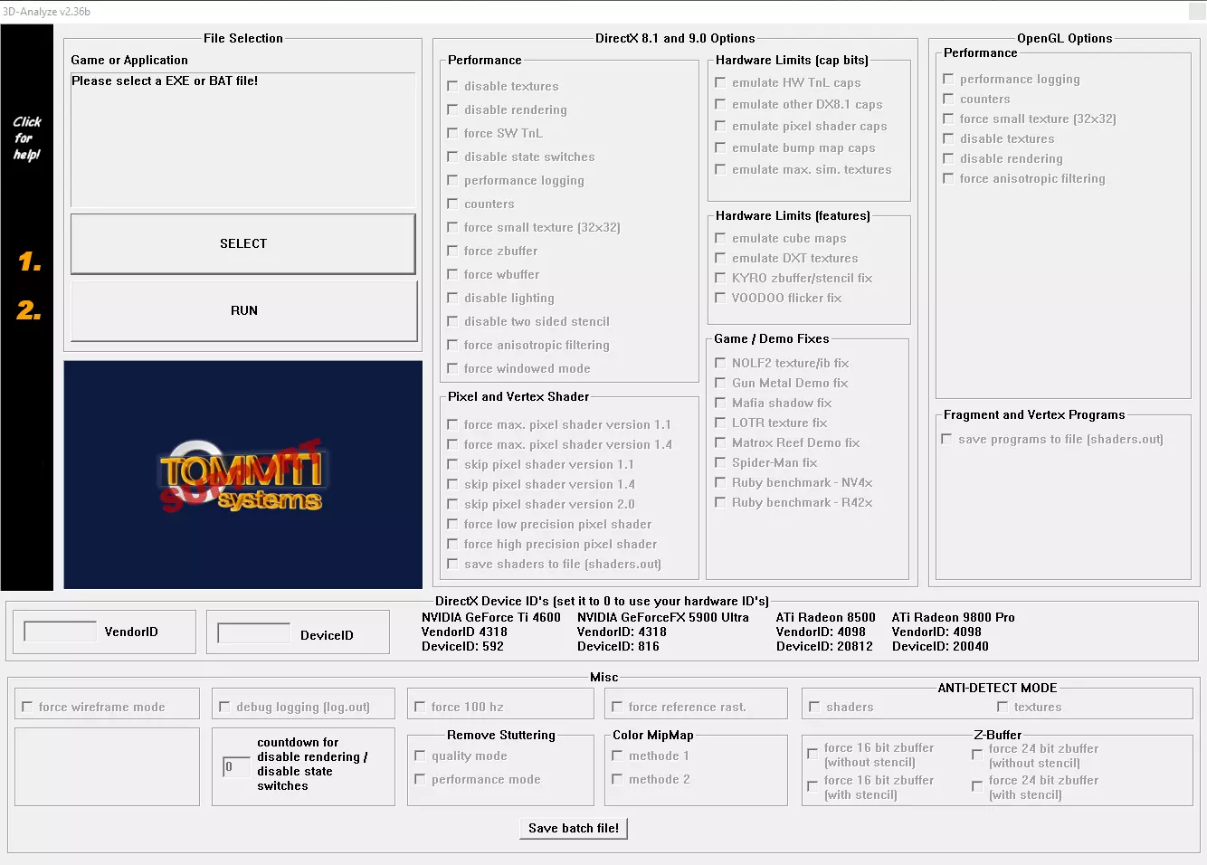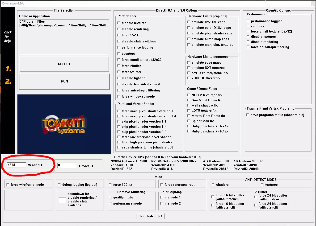 (看起来有点吓人,但别担心) 再次前往你的游戏目录中的“bin”文件夹,并重命名TimeShift.exe。**非常重要的一点是只重命名该文件,不要对其进行任何其他操作**。这样做是为了避免命名冲突,并在之后清理这个繁琐的修复过程。我将其重命名为TimeShift.old,但你可以随意命名。 回到3D-Analyzer,点击左侧的大“Select”按钮。再次进入“bin”文件夹,选择你刚刚重命名的可执行文件。 将VendorID更改为4318。**无需对其他选项进行任何操作**(它们可能会提升性能,也可能导致游戏崩溃,但几乎肯定会让游戏画面变得一团糟)。