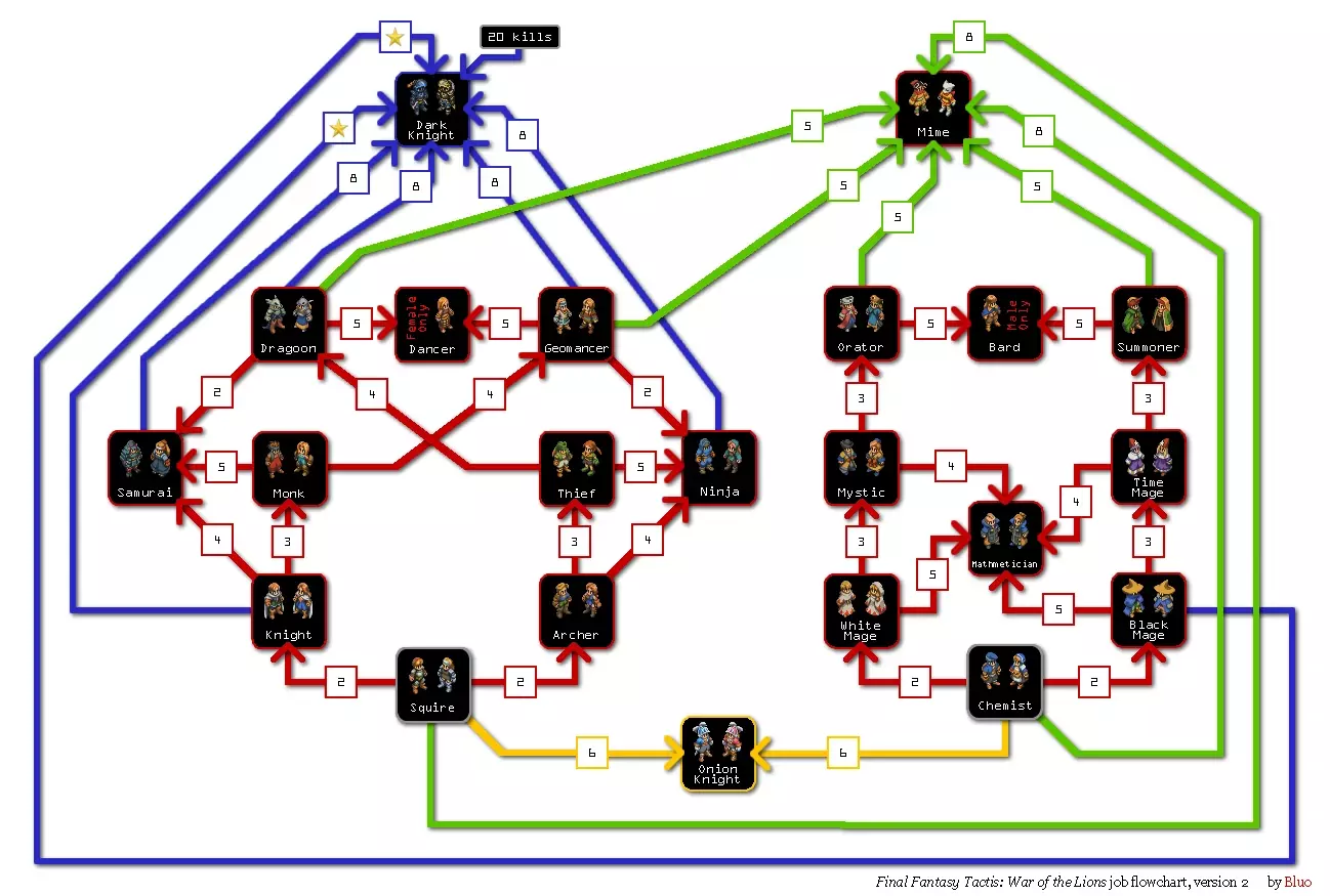 职业树展示了《最终幻想战略版》中所有职业及其解锁的等级要求+Build+隐藏角色+技巧。我会持续更新本指南,增加更多内容和章节。职业树以图片形式呈现。此增强版采用原版组合,而非《狮子战争》版。本应是原版的解锁要求,但经过实际游玩后,我发现此增强版的解锁要求实际上与《狮子战争》一致。这一点已通过武僧和风水士得到确认。