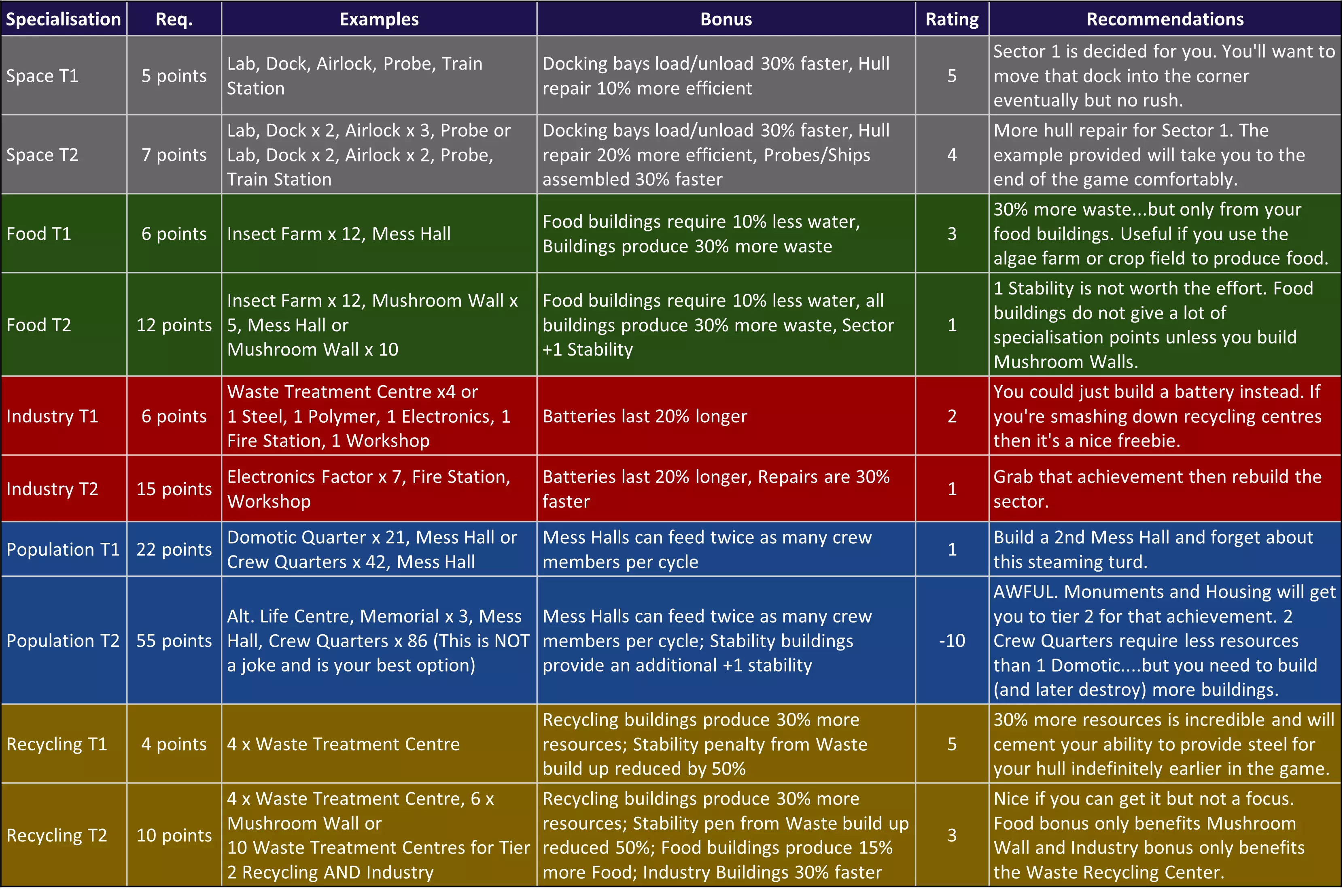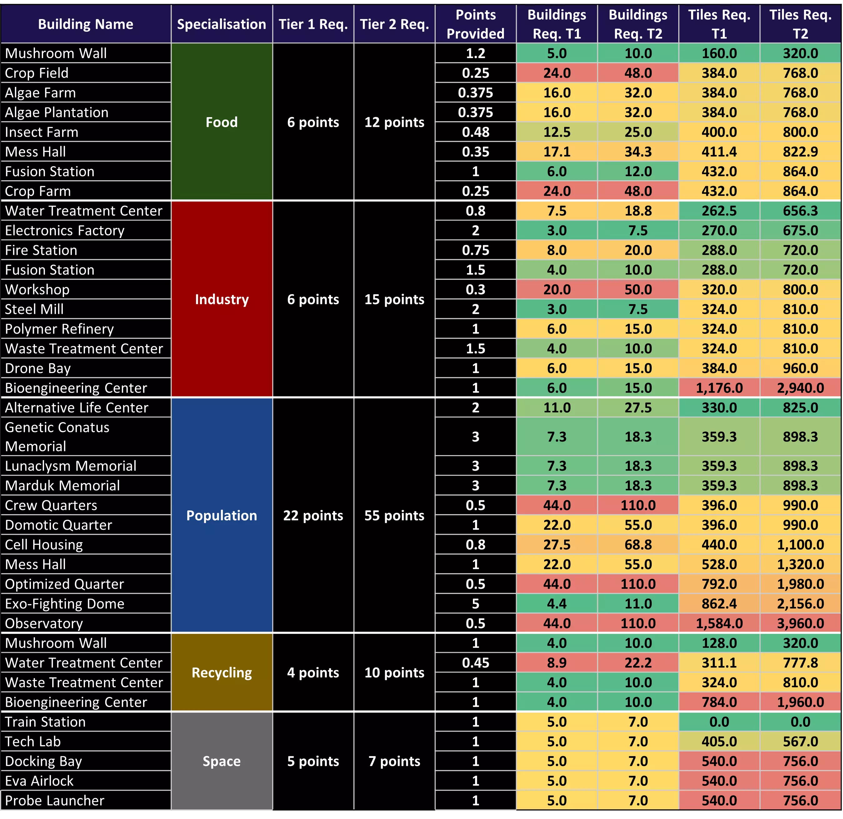 详细的建筑专精点数 哦……你还在这儿?这就给你一颗“红药丸”…… 什么是神级建筑? 实际上只有一个。 蘑菇墙——是食物和回收专精的最佳建筑。蘑菇墙?到底是谁把这玩意儿偷偷加进来的?没人会建造它!至少,以前没人这么做,但如果你想获得食物或回收的二级专精,那你最好开始把这东西往墙上堆。 我现在已经计算过数据了。这个建筑是整个游戏中每周期生产食物最多的。完全研究并配备二级回收专精后,它每1.7周期能生产14单位食物。这比藻类农场多得多(每周期8+单位对比5.75单位)。而且它不需要水,这点很赞……但这确实需要大量废料,而这是个问题,因为你需要用废料来生产钢材。所以实际上你应该让大多数这类建筑保持关闭状态。只需1到2个处于激活状态,就能减轻你的昆虫养殖场的压力。 其他最佳建筑 电子工厂:用于工业生产 船员宿舍:用于人口增长(2个船员宿舍需要30钢材,而1个智能家居宿舍则需要80钢材) 科技实验室:用于太空研究 废料处理中心:在回收和工业生产两方面都表现平平,但它能同时进行这两项工作,可以说是游戏中最有用的建筑。 应避免建造的建筑 无人机 bay 天文台:建造它以获取永久加成,然后就可以拆除了。 优化宿舍:显然是游戏早期到中期不错的住房选择,但它的数据确实不够“优化”。 作物农场:与藻类农场类似,但食物产量更低。 外空战斗穹顶每格点数表现不佳,但对全舰士气有益。 末日表格 我现在已按建筑的专长对其进行分组,并按所需总格数排序,这样你就能看到哪些建筑占用空间最少。具备两种专长的建筑会在列表中出现两次。 每个区域的空间有限(1680格),下方表格显示,要达到二级水平颇具难度,因为大多数建筑即使采用取巧方式升级,也至少需要700-800格(不含道路和仓储)。不过,大多数建筑除外,【食品】和【回收】建筑是例外…… 每个区域的总格数数据由Nighthalk提供。