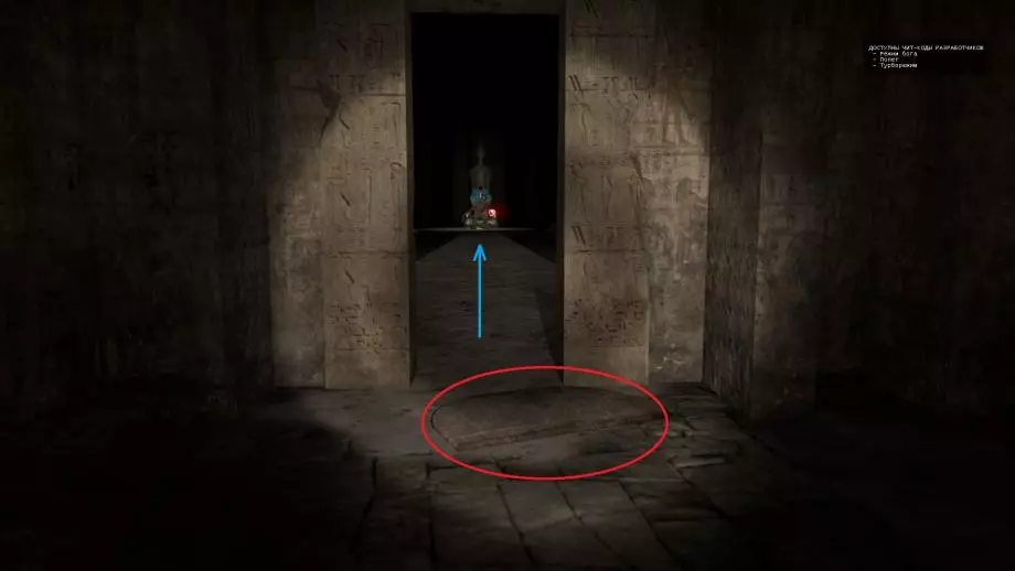 地下王国的力量 1.在第一个房间里,台阶右侧放着一块石板。 文字:阿努比斯取走了月眼,并将其置于自己位于无尽黑暗中的王座之上。他对神谕说道:只有知晓者方可进入。