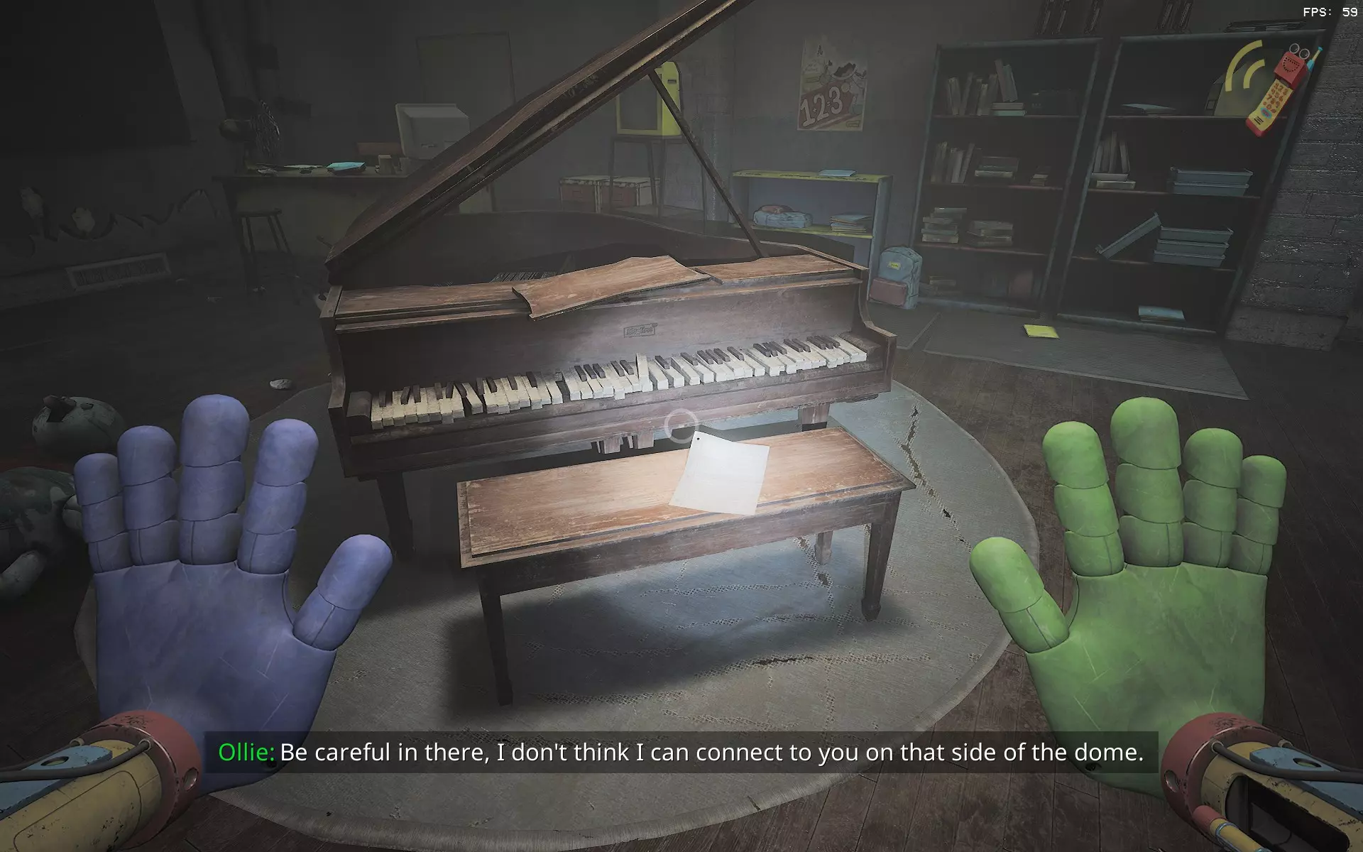 加入合唱 最终你会到达一个需要绿色钥匙卡才能继续前进的房间。在那个房间里,你可以找到钢琴恐龙纸板模型。只需完整听完对话即可。