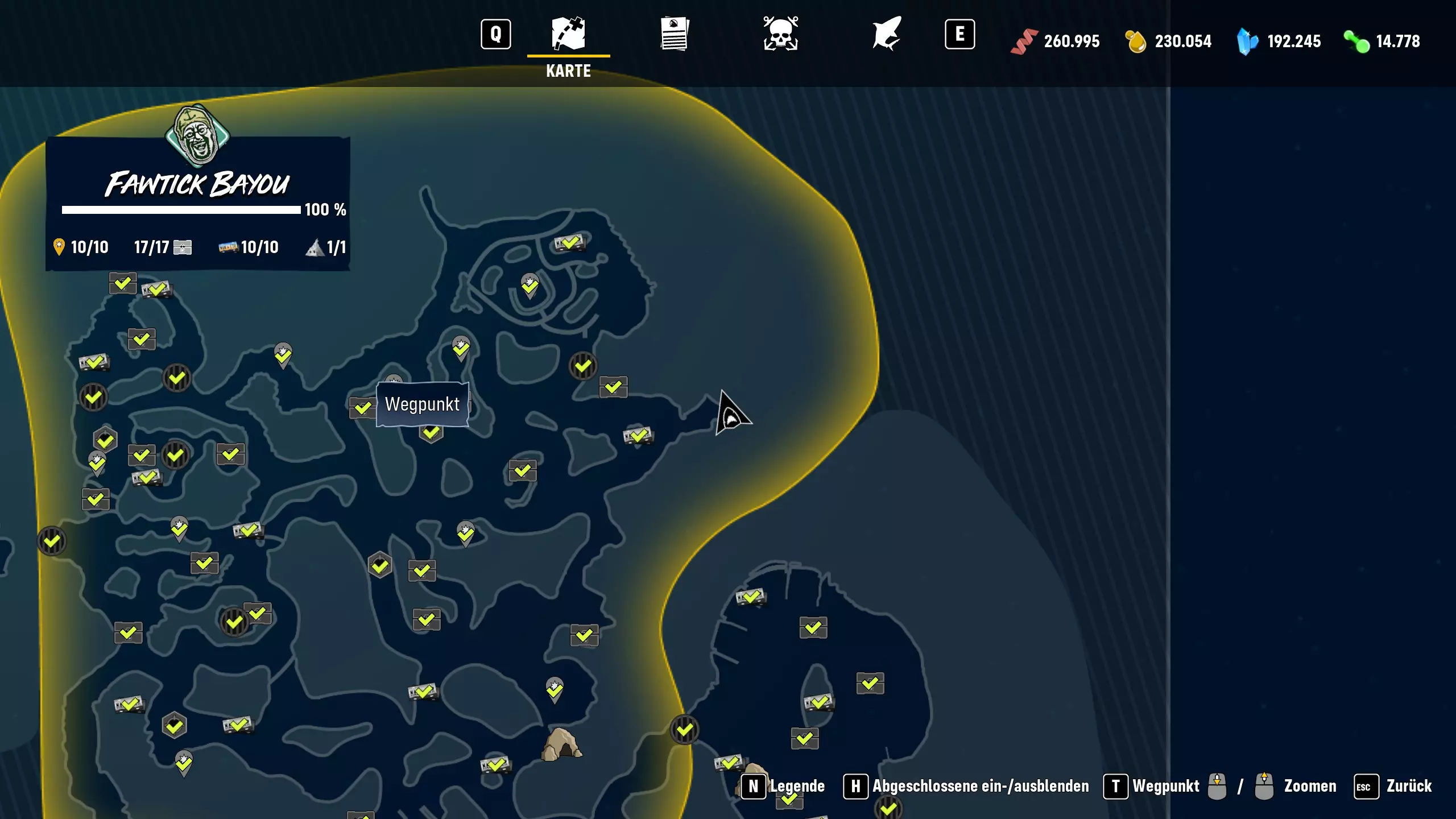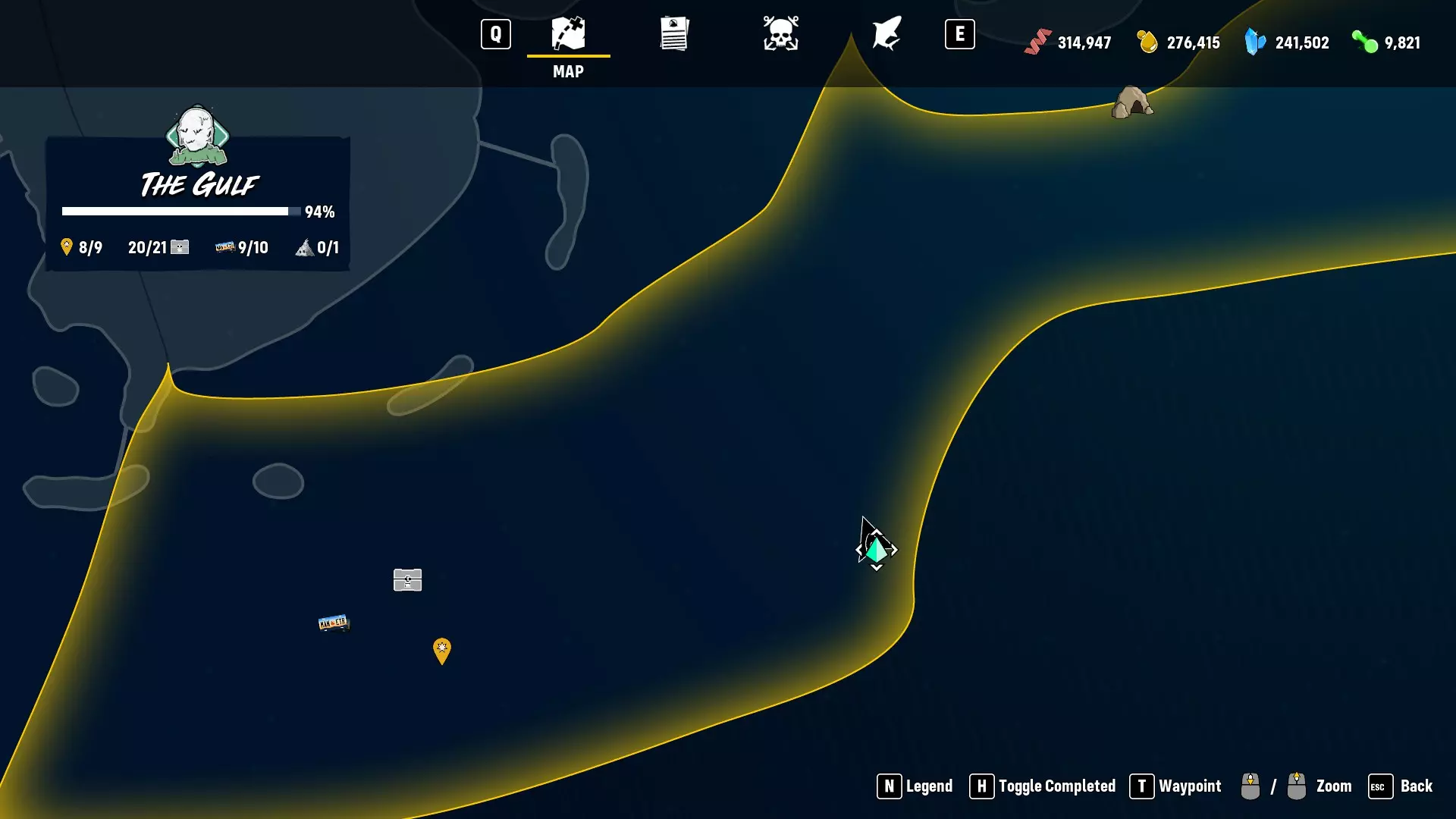 科学实验 解锁100%的可用进化 你应该去哪里寻找它们 缓存、车牌和地标彼此相邻。 最后一个任务发布者在我的玩家标记(黑色三角形)所在的位置。那里有一艘沉没的船,周围有一些鱼雷。