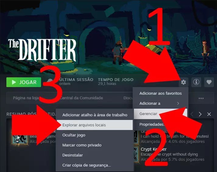 支持者 最后支持此次粉丝翻译的人:brunosrc、JRivolli、SAMUELSAM_BR、rian 下载 THE DRIFTER 游戏和翻译的最后更新时间为2026年2月11日11:08,版本1.1.2。如果游戏在此日期之后更新,当前翻译将无法使用,请等待并告知我进行更新。 已修复Alanzoka视频中实验室里的对话不同步问题。安装步骤 下载翻译文件后。 打开游戏文件夹。 进入Steam库并选择该游戏。 点击【设置】(箭头1)。 点击【管理】(箭头2)。 然后点击【浏览本地文件】(箭头3)。 游戏文件夹将会打开。