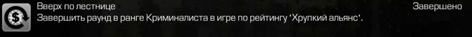 附:我是在【犯罪头目】等级(2800点评级分)时才获得这个成就,但所有我帮助过的人都比我先拿到,他们可能是满足了以下条件。因为很多人由于bug向180度方向射击,却能拿到很多钱并最后成功逃脱。玩家数量:2人 地图:地铁 模式:脆弱联盟 与成就【Криминальный босс】关联 左侧玩家:技能+10 右侧玩家:获得成就【Вверх по лестнице】 左侧玩家行动:在地图上杀死除右侧玩家外的所有人;不拿银行里的钱;在回合结束前不死亡;第一个与另一名玩家坐上同一辆车 在下一个大厅与右侧玩家交换所有任务,并留下话说:“我”“累了,我就是个小角色”。右侧玩家的行动: 不击杀地图上的任何人,必要时呼叫“老爹”帮忙; 仔细拿走银行里的所有钱(400万美元); 在回合结束前保持存活; 最后一个和其他玩家坐上同一辆车; 克制住去研究行驶中火车零件或玩弄灭火器的想法。 疯狗