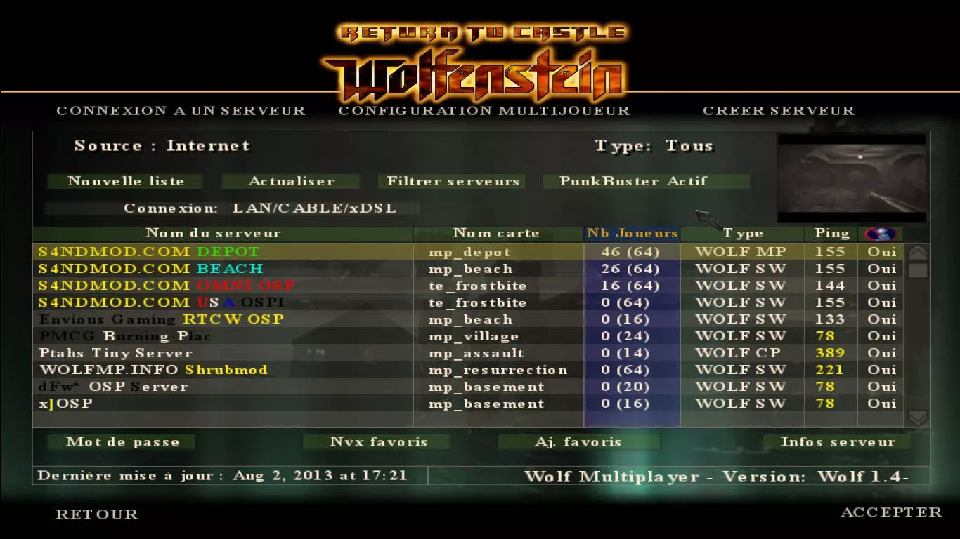 别忘了在上面的屏幕中启用PunkBuster!或者如果你更喜欢使用控制台方式(QWERTY键盘按~键,AZERTY键盘按²键),检查/cl_punkbuster的值,如果不是1,输入/seta cl_punkbuster 1。 【不再需要】如果此时仍然无法正常运行…… 请检查以下事项: - 你是否以管理员身份启动记事本。 - 你保存文件时是否没有添加txt扩展名。 打开hosts文件,检查你添加的行是否存在且没有拼写错误。 确认你的游戏已在防火墙中设置为例外。 检查设置中是否存在CD密钥:参见下方部分的顶部内容。 如果完成这些检查后,你仍然看不到服务器列表……那么你属于少数遇到此问题的用户之一^^' 你可以尝试修改1。41个包含硬编码新主服务器地址的二进制文件(感谢cole) 以下是一些人尝试过且有效的分发文件(感谢sal) 希望一切顺利,我自己还没有尝试过。 现在你需要了解的游戏相关事项 现在,我们有了服务器列表。但要想顺利游戏且不遇到诸如被踢出等问题,你还需要了解几个细节: 检查设置中是否存在CD密钥 似乎部分玩家的设置中默认没有CD密钥,因此在防护良好的服务器上会被封禁,直到输入CD密钥为止。 启动多人模式,然后在选项中的CD密钥处进行检查。如果找不到该文件,请浏览主文件夹,用记事本打开rtcwkey文件:其中包含密钥。 注意,最后一个字段为空,这是正常现象。密钥长度为16个字符。 允许下载自定义内容 部分服务器运行Shrubmod(娱乐模组)或OSP(竞技模组),其循环中可能包含自定义地图以及自定义内容(模型、音效等)。 但默认情况下,游戏不允许下载自定义内容,且图形用户界面中没有启用该功能的选项。 要启用客户端下载系统,请打开控制台(QWERTY键盘按~键,AZERTY键盘按²键),并输入: /seta cl_allowdownload 1 遗憾的是,游戏不支持通过HTTP协议下载,这意味着下载速度会非常慢。不过别担心,有一个解决方案:它叫做RtCW地图下载器。启动后它会在后台运行(可以在任务栏看到图标),当需要下载文件时,它会关闭游戏,为你下载文件,然后重新启动游戏。 服务器控制台变量:有些服务器会强制设置某些控制台变量值,因为这些变量可能会带来优势。即使是默认值也可能被强制设为其他值或值范围。 本部分(应该)暂时为空,我(应该)会很快添加相关的控制台变量。如果你因为控制台变量值被踢出,请阅读提示信息:你应该能看到是因为控制台变量还是其他原因。然后,打开控制台:你会找到更多详细信息,包括相关的控制台变量及其数值。 进阶游戏性控制台变量 其实也不算太进阶,但如果你是按照本指南操作的话,可能并不了解这些变量,而且你需要通过控制台(或添加启动参数,或直接编辑wolfconfig_mp.cfg文件)来进行设置。 显示帧率计数器 /seta cg_drawfps 1 修改帧率上限(默认90) 供你参考,常用数值为125。 /seta com_maxfps 125 更改视野范围(FOV - 默认90) 我记得在《重返德军总部》中,允许的最大视野范围是120,但我使用的是110……你可以试试,如果因此被踢出游戏的话就知道了。 不过别担心,使用110的数值是不会被踢出的!设置视野命令:/seta cg_fov 110 如何寻找无机器人的服务器 当你浏览服务器列表时,可能会加入有机器人的服务器,而你想寻找的是真实玩家。遗憾的是,游戏内浏览器无法筛选掉机器人服务器,但有一些在线追踪器可以做到。 最老牌的是SplatterLadder。 点击sl.Serverlist,然后选择游戏版本,勾选RtCW 1.40/1.41以仅显示重返德军总部服务器。 接着,在属性栏的第二列第三项,你可以通过勾选来筛选掉服务器上的机器人,直到出现红色叉号。 最后推荐一个晚间人数较多的服务器,通常有30多名玩家,ECGNetwork:64.237.36。我和两个朋友有一个私人出资的多人服务器,运行着海滩地图。你可以在控制台输入/connect 46.165.204.172:27960加入。如果周围没有其他玩家,服务器里也会有机器人。祝你游戏愉快。 这基本上就是我今天做的事情,现在我已经能够正常游戏,不会被PB踢出了。 主要参考了这些论坛,我只使用了Steam用户需要的内容(年度版地图包已包含在内)。提供服务器列表提示的帖子。额外文件 也许是我运气不太好,我加入的mp_resurrection服务器下载速度非常慢,所以这里有一些你可能更愿意通过浏览器下载的地图。 欢迎提出建议、问题和评论。FileFront链接可能对某些人不起作用,因为他们前段时间封禁了一些国家,如果确实有很多用户遇到这个问题,我会在测试后添加更多链接。 祝你游戏愉快。